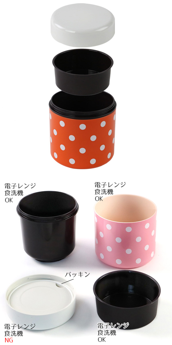 二重構造で冷めにくく、電子レンジで温めもできるお弁当箱です。大き目のドット柄が可愛いポイント。カラーは6色からお選びいただけます。大人でも使えるシックなカラーもご用意しております。