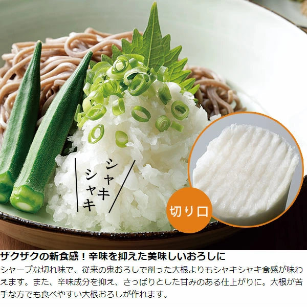 シャープな切れ味で、従来の鬼おろしで削った大根よりもシャキシャキ食感が味わえます。また、辛味成分を抑え、さっぱりとした甘みのある仕上がりに。大根が苦手な方でも食べやすい大根おろしが作れます。