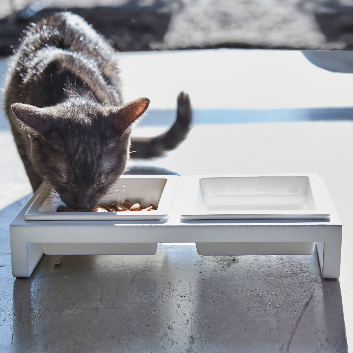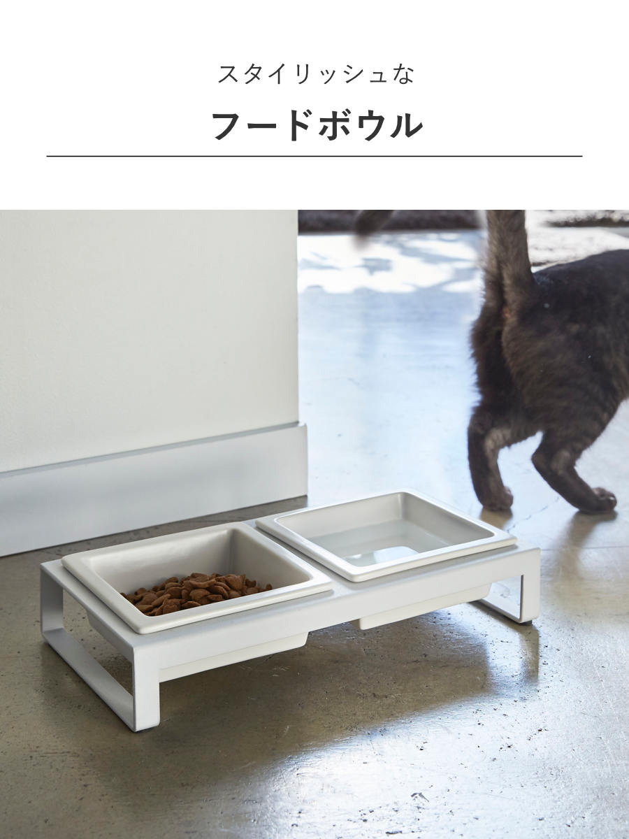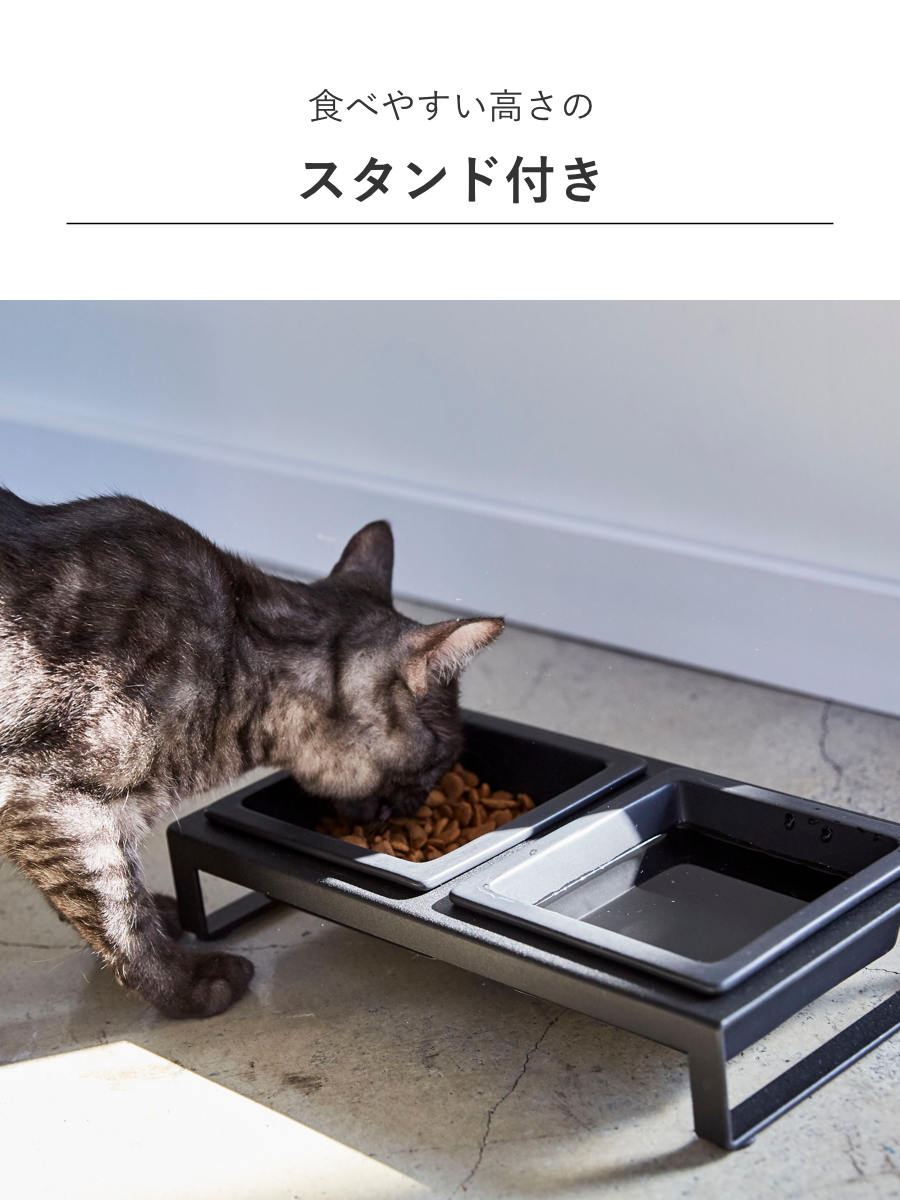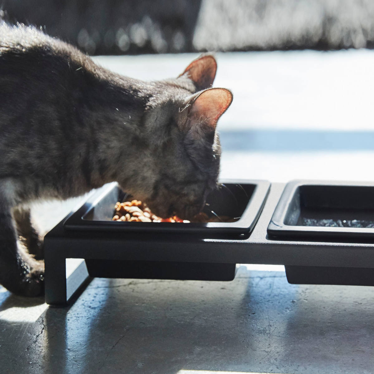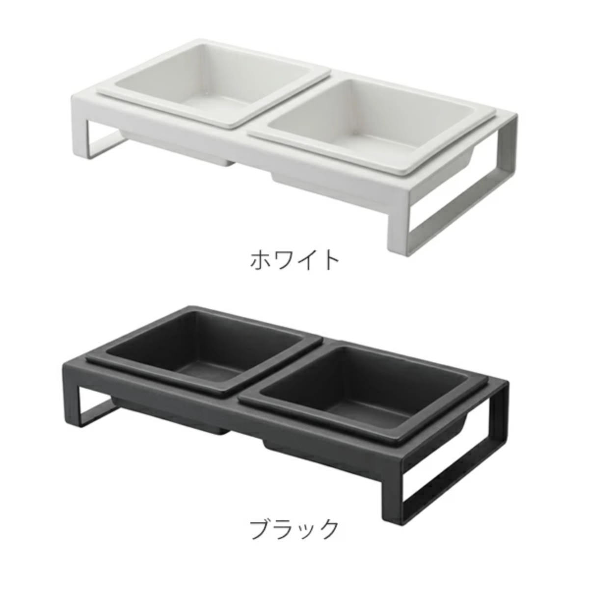 シンプルでスタイリッシュなデザインはインテリアによく馴染みます。ボウルが2つ付いているので、お水とフード、2種類のフードを分けて入れるなど様々な使い方ができます。猫はもちろん、小型犬にもぴったりのサイズです。