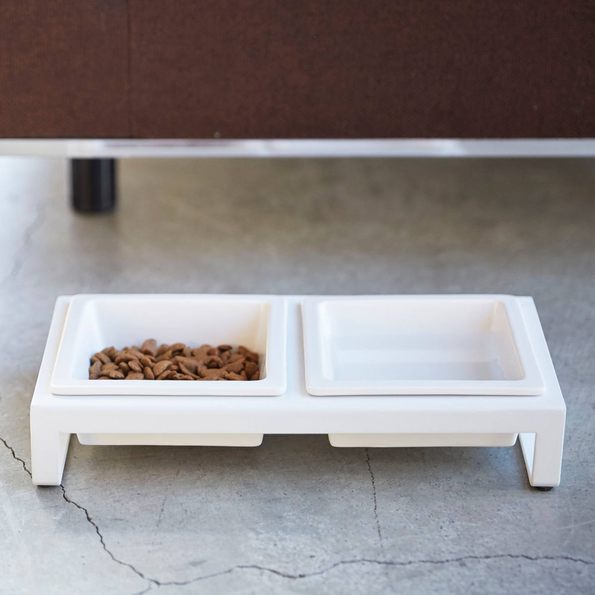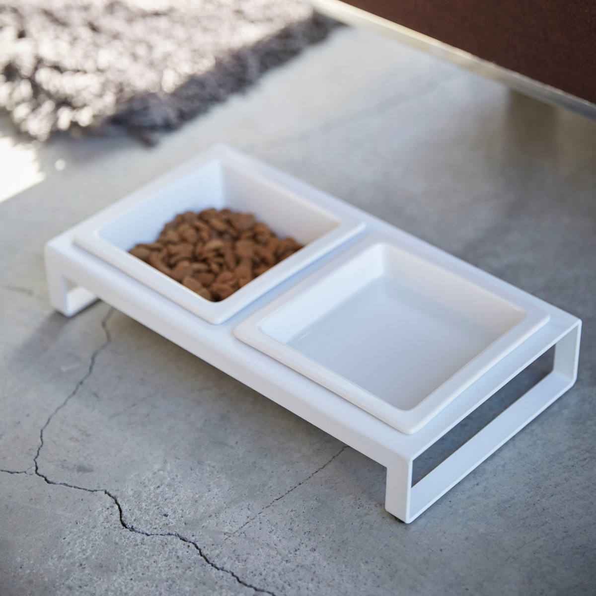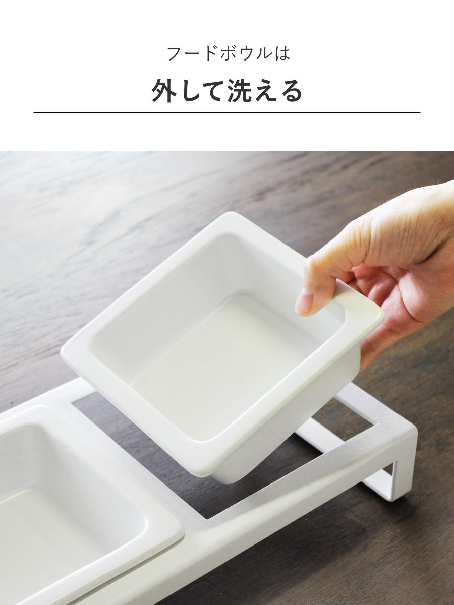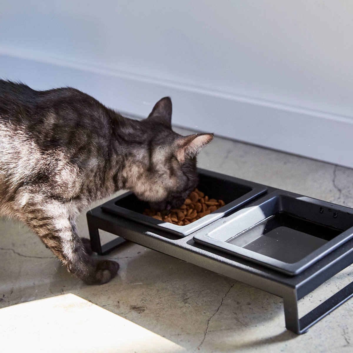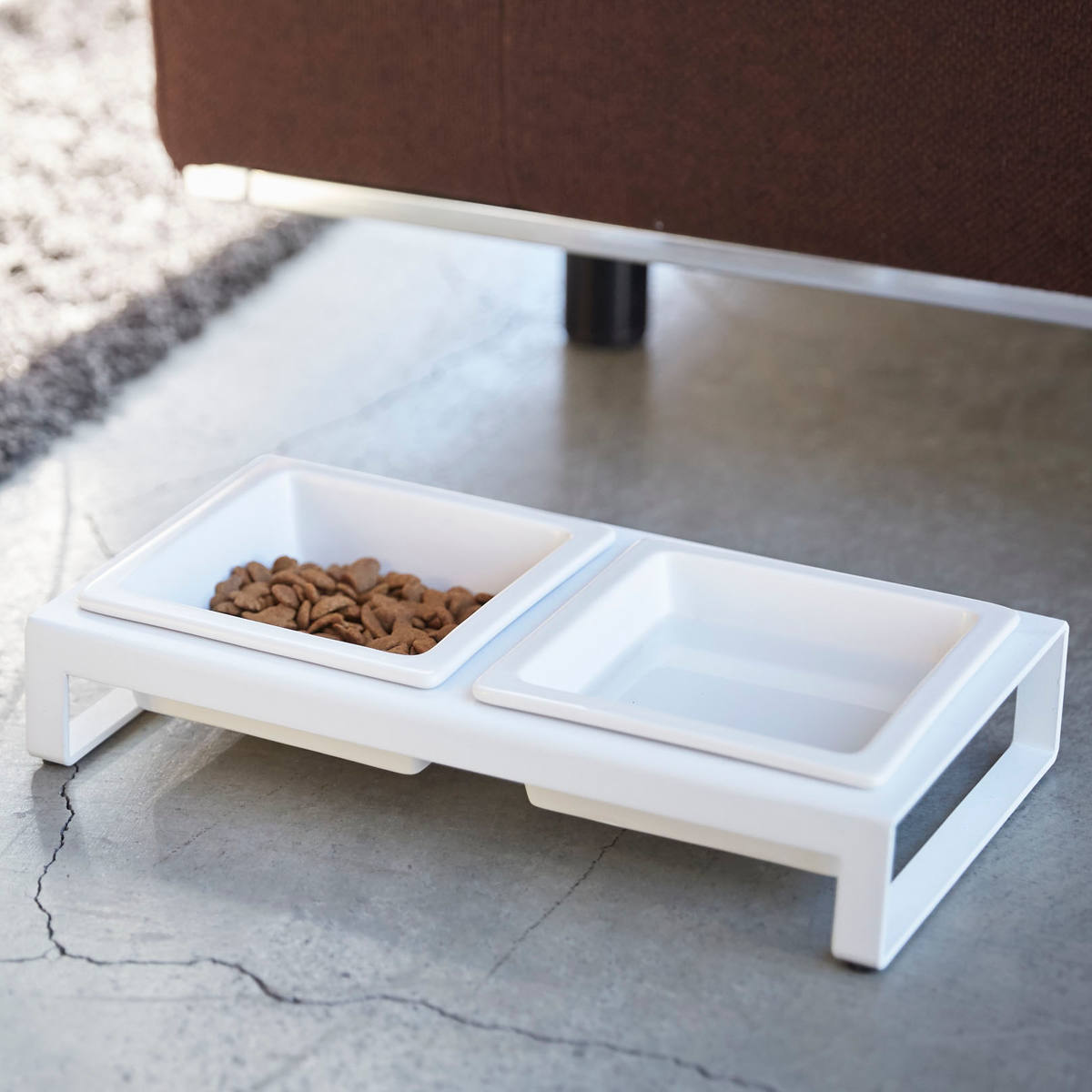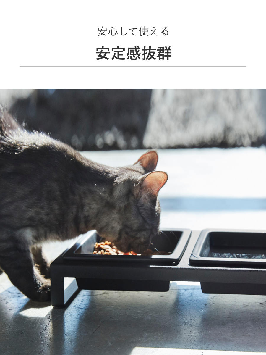 シンプルでスタイリッシュなデザインはインテリアによく馴染みます。ボウルが2つ付いているので、お水とフード、2種類のフードを分けて入れるなど様々な使い方ができます。猫はもちろん、小型犬にもぴったりのサイズです。