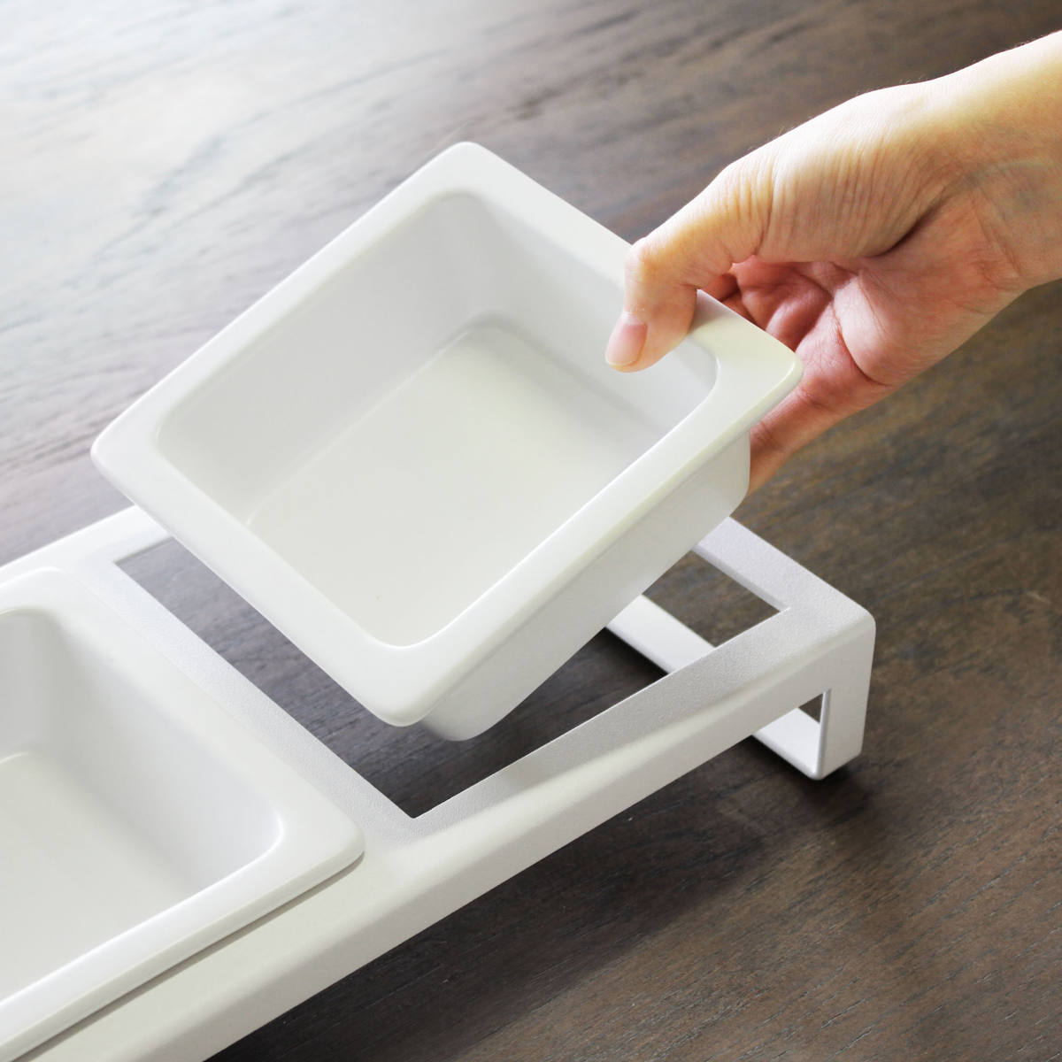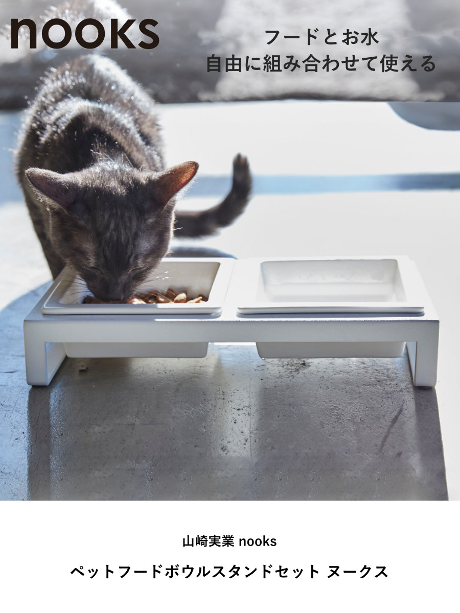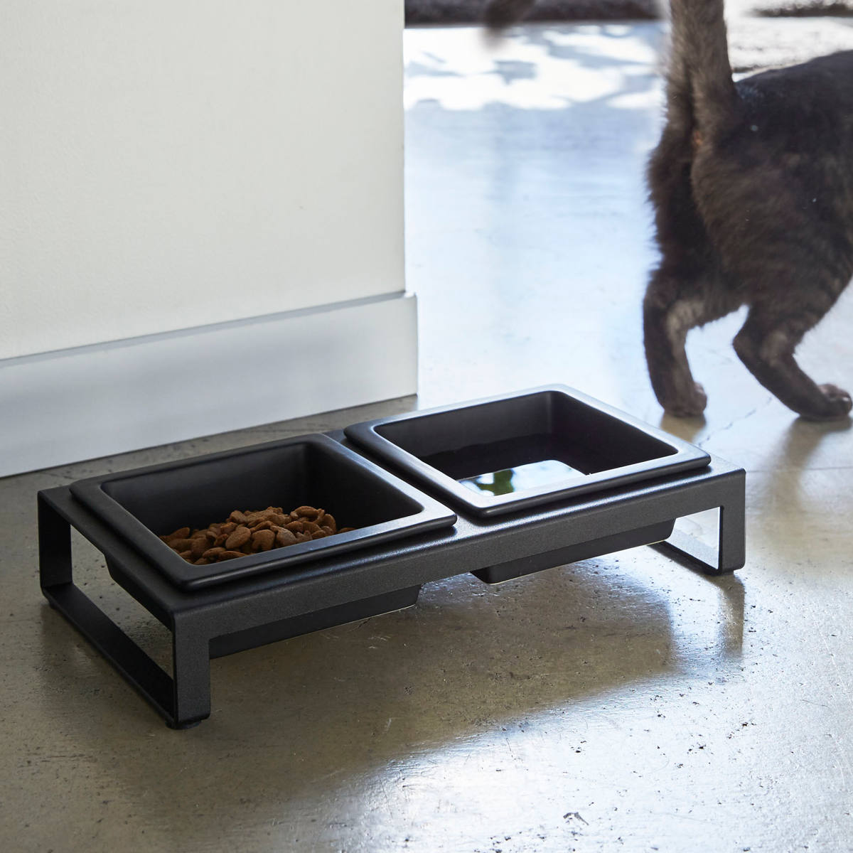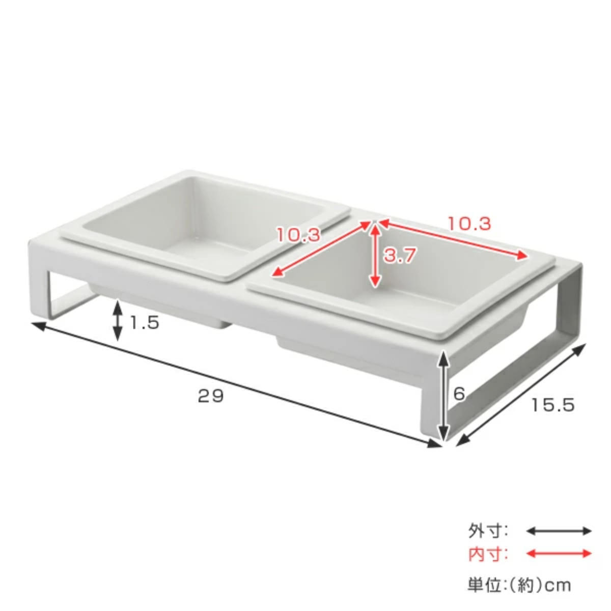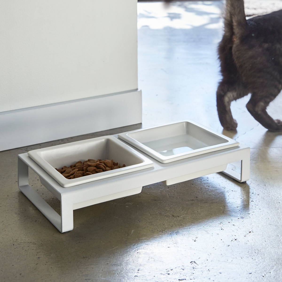 シンプルでスタイリッシュなデザインはインテリアによく馴染みます。ボウルが2つ付いているので、お水とフード、2種類のフードを分けて入れるなど様々な使い方ができます。猫はもちろん、小型犬にもぴったりのサイズです。