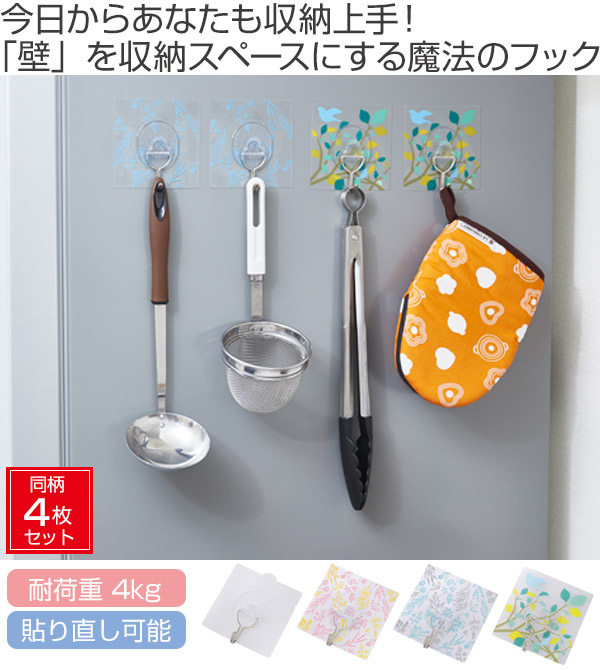 ペタっと壁に面で貼り付けるタイプのフックです。「面」で貼ることによって摩擦力が上がり、4kgもの重さに耐えることが出来ます。4kgは一般的に2リットルのペットボトル2本分です。