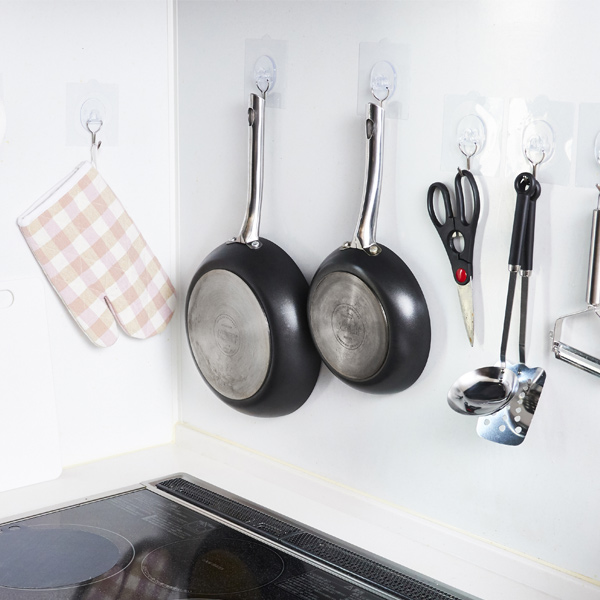 物がたくさんのキッチンスペースも「壁」にフックを付ければ収納スペースに早変わり!フライパンの様な重さのある物もしっかりと掛けることも出来ます。