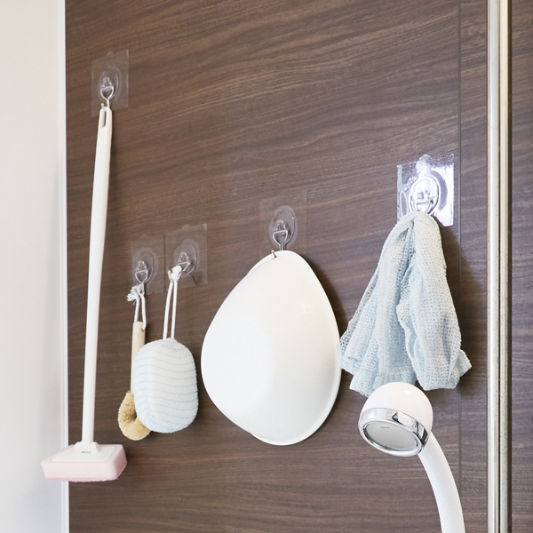 物が散らかりやすいバスルームも全て掛けて収納するとスッキリとします。掛けて収納することにより、水垢が付きにくくいつでも清潔にご使用頂けます。