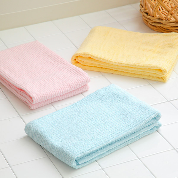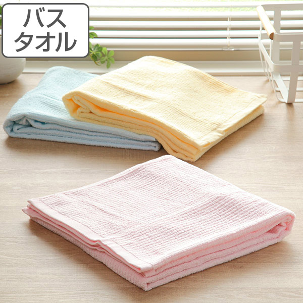 パステルカラーの落ち着いた色合いと、シンプルなデザインがおしゃれなバスタオルです。綿100%の無撚糸なのでふんわりと柔らかく、心地良いやさしい肌触りです。