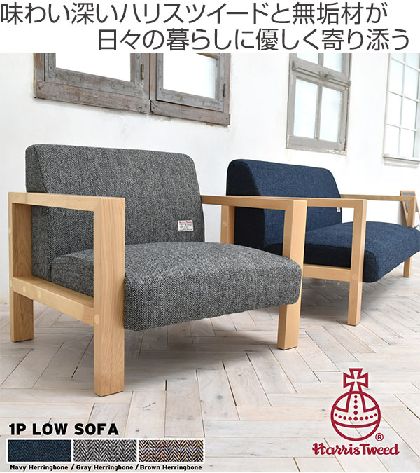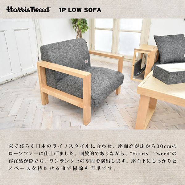 ざっくりとしたウールと色使いが、”味わい深く、美しい”。長く受け継がれる伝統的な生地、ハリスツイードを贅沢に使用した1人掛けのソファです。座面高が床から30cmのロータイプなので、お部屋に圧迫感を与えず空間がすっきりと見えます。開放的でありながら、“ハリスツイード”の存在感が際立つ上質なソファです。