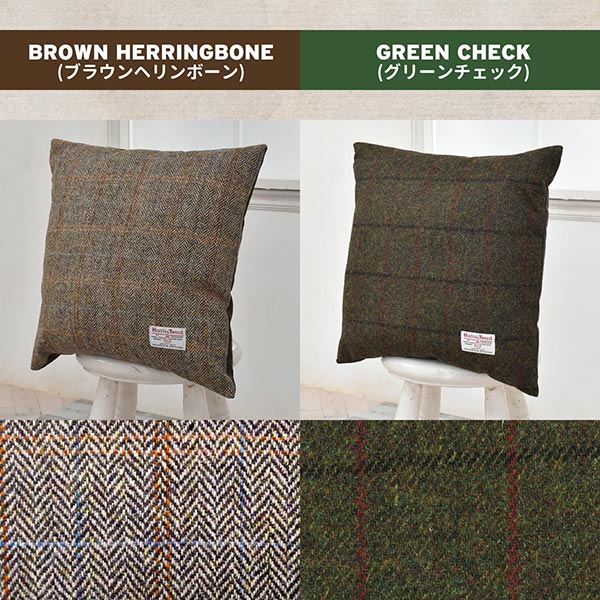 上質なツイード生地と裏地は全色肌触りにこだわってブラウンのポリエステル100%の生地を使用しています。使いやすい42.5cm角サイズです。いつも使うものだからこそちょっとお洒落にしたい、そんな気持ちにこたえてくれるクッションです。