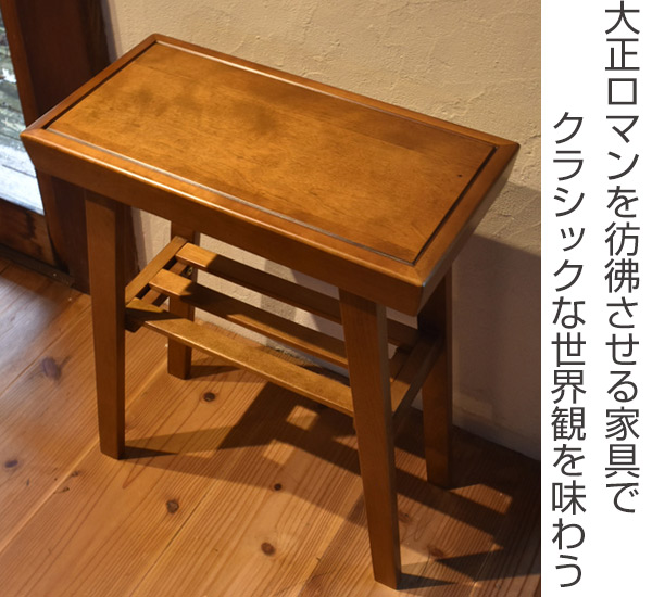 大正ロマンを感じさせる、クラシカルなデザインのサイドテーブルです。和室・洋室のどちらにもなじみ、同シリーズのソファやスツールと組み合わせるとノスタルジックな空間ができあがります。
