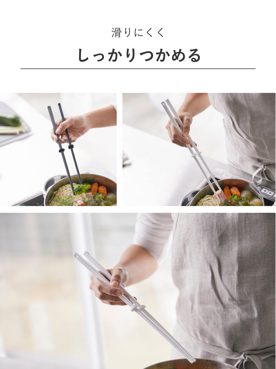 箸の先端には滑り止め加工がほどこされ、小さい食材でもしっかり掴むことができます。太めで転がりにくく長時間持っていても疲れにくい角型形状です。