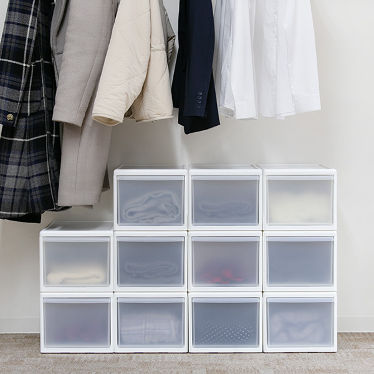 中身を隠したい場合にも引き出しの前面に色紙や壁紙を切り取った物を貼れば、自分の好きな柄に変更してもいいなと思いました。クローゼット上で使用する場合は、高いところの荷物の出し入れがしにくいので使用頻度の低い物の収納に向いています。