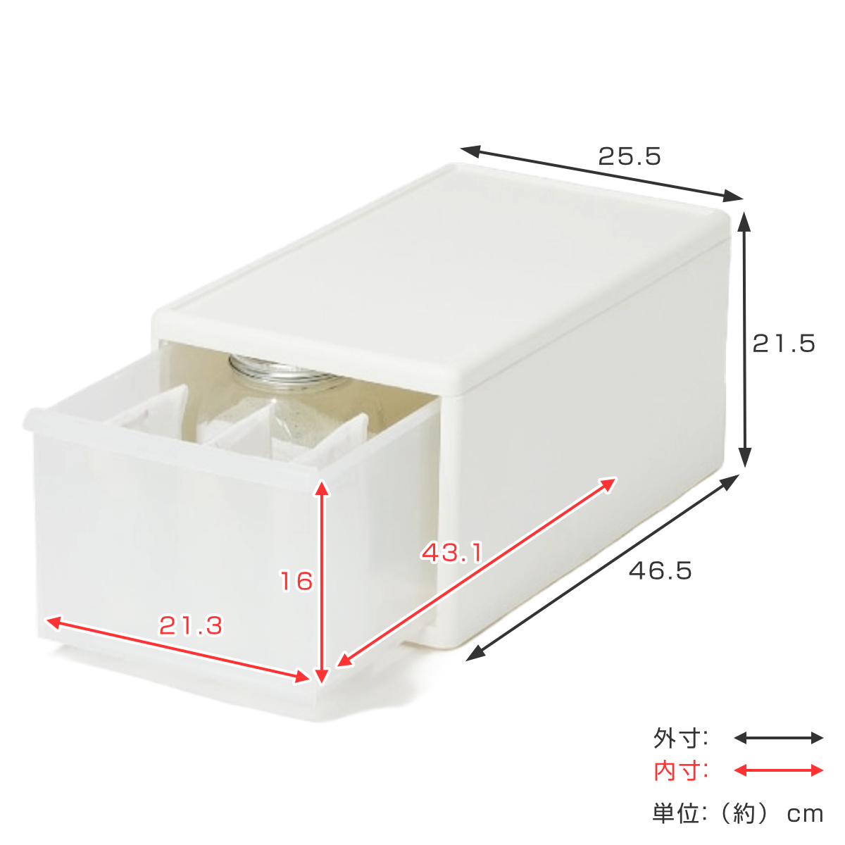 | サイズ | 約 幅25.5×奥行46.5×高さ21.5(cm) 引き出し内寸:約 幅21.3×奥行43.1×高さ16(cm) |