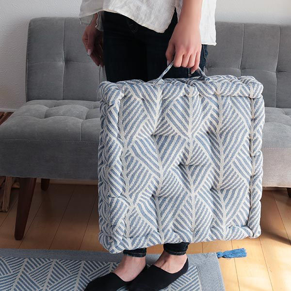 側面に持ち手が付いているので、持ち運びやすいです。移動させて背あてクッションやオットマンとしても使用できます。