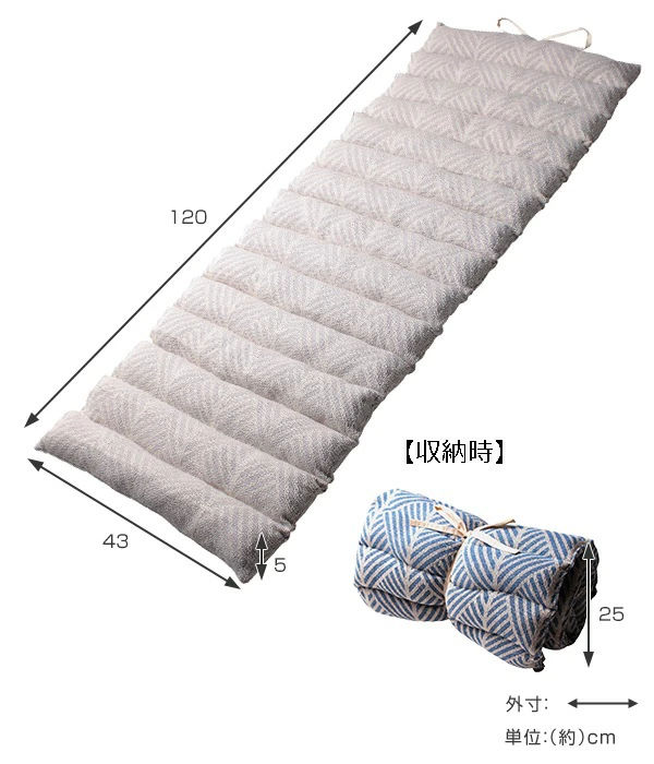 全部伸ばしてもよし、一部分を丸めて枕にするもよし、快適なごろ寝ができます。長座布団としても使用できます。