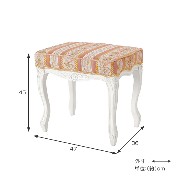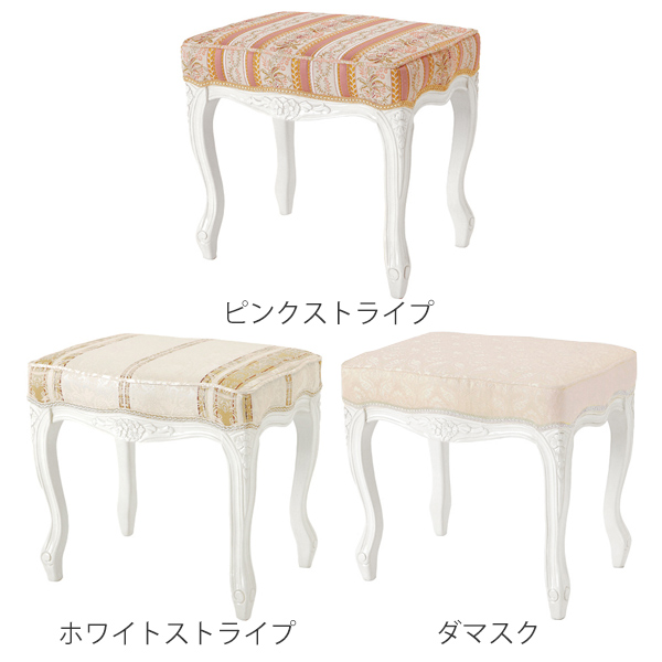 ヨーロッパの伝統的なスタイルである、定番の猫脚や優雅なフォルムに彫刻のデコレーションが魅力的なスツールです。同じシリーズのドレッサーを合わせればワンランクアップした空間が演出できます。