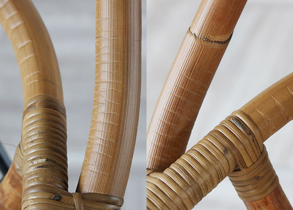 自然な風合いや素材の温かみを味わっていただけるように、材料に皮付きの籐をそのまま使用しています。そのため、材料1本1本の色の違いや、黒ずみ、斑点の部分がございます。また、籐の表面のところどころに傷のようにホーロー質がはがれた部分があります。これはトゲのある「節」を取り除いた削り跡です。これらは不良ではなく、天然素材特有の風合いによるものです。