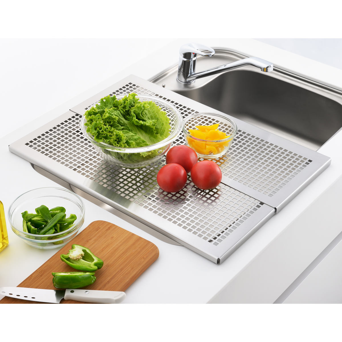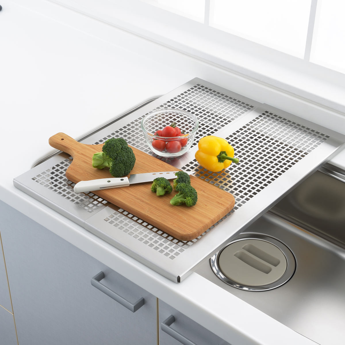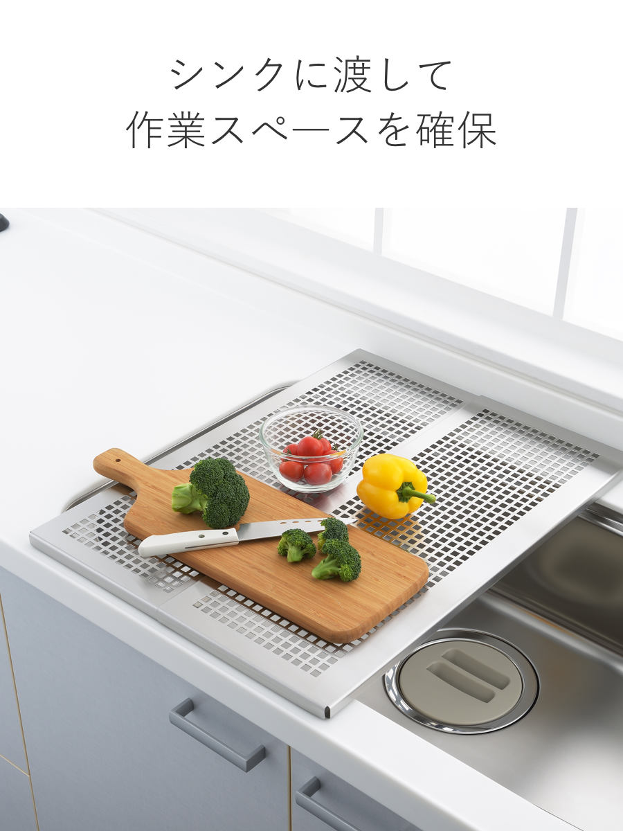 シンク上に設置するだけで作業のスペースを確保できる頑丈なスライドプレートです。盛り付けをする時にお皿を並べるスペースが欲しい、洗い物の量が多いから水切りスペースが欲しい、そんな時にシンクに設置すれば、簡単に作業台や水切りとして使用することができます。