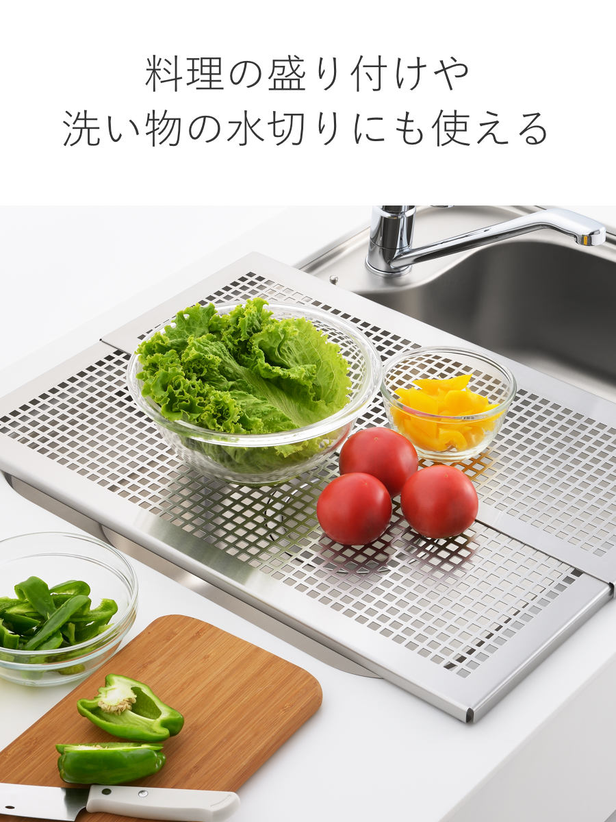 ●シンクに渡して作業台や洗い物の水切りに使えるステンレスプレートです。