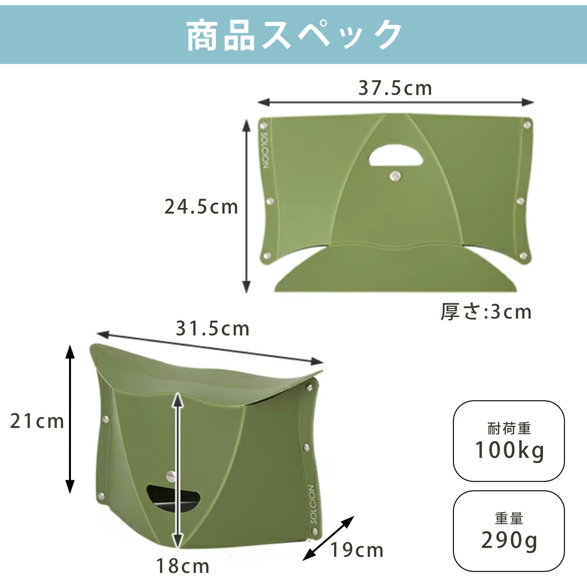 | サイズ | 約 幅31.5×奥行19×高さ21(cm) 座面高:約 18(cm) 折りたたみ時:約 横37.5×縦24.5×厚さ3 (cm) |