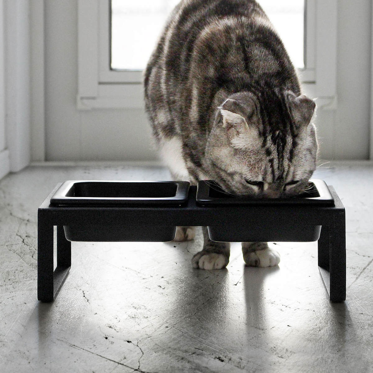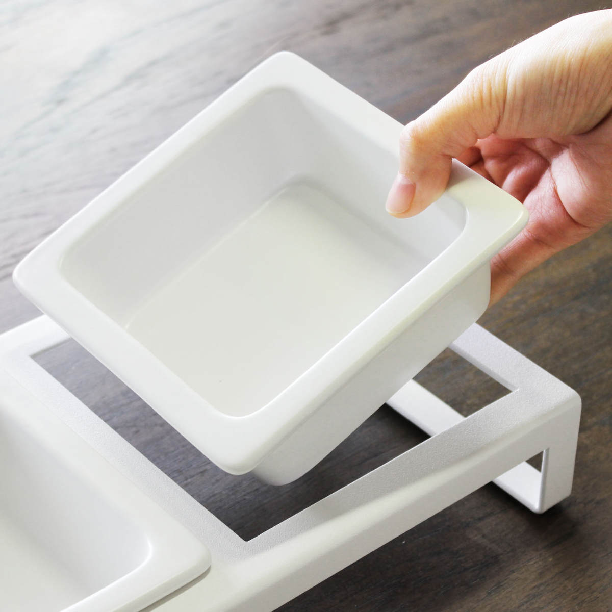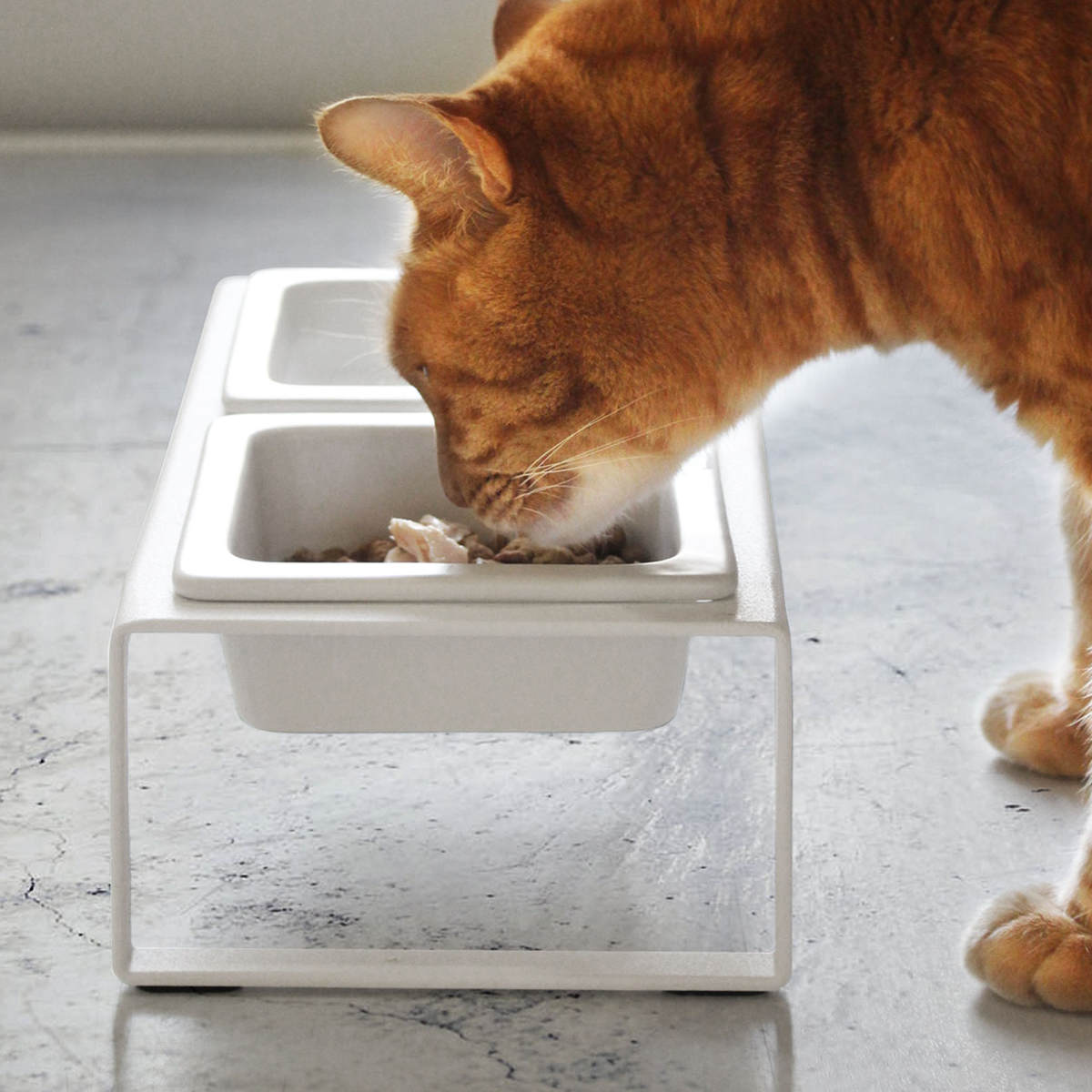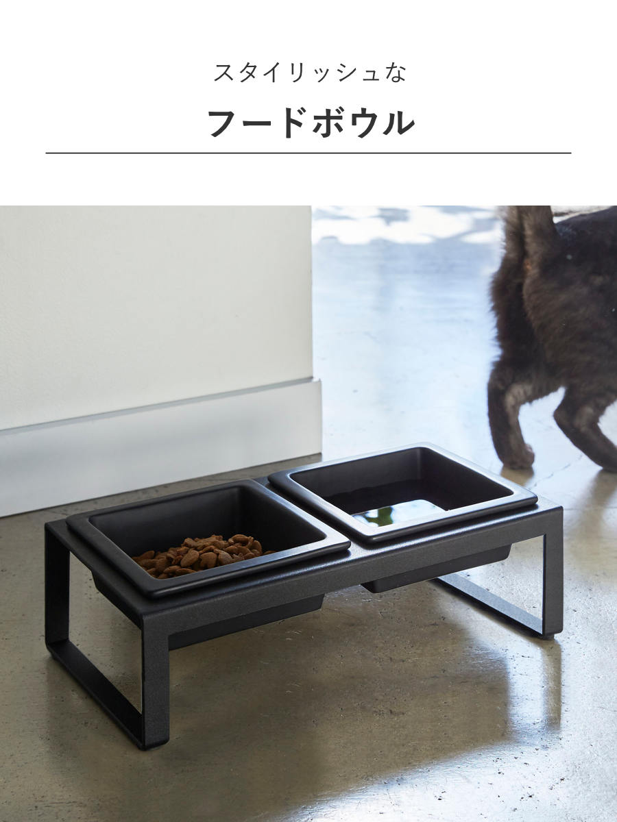 キッチンやリビングのインテリアの邪魔をしないシンプルでスタイリッシュなデザインです。ボウルが2つ付いているので、お水とフード、2種類のフードを入れるなど自由に組み合わせて使えます。