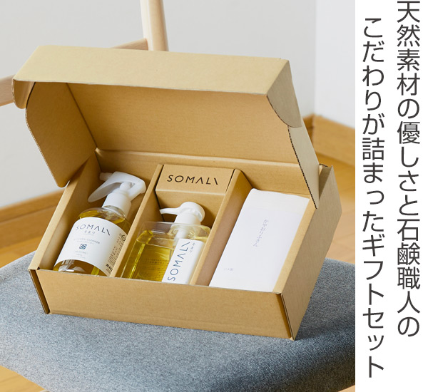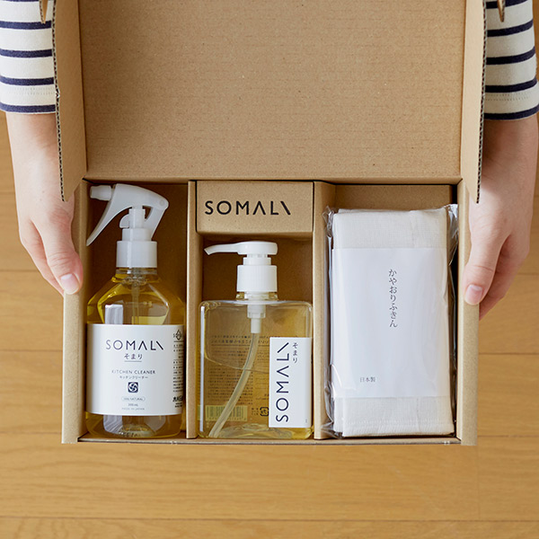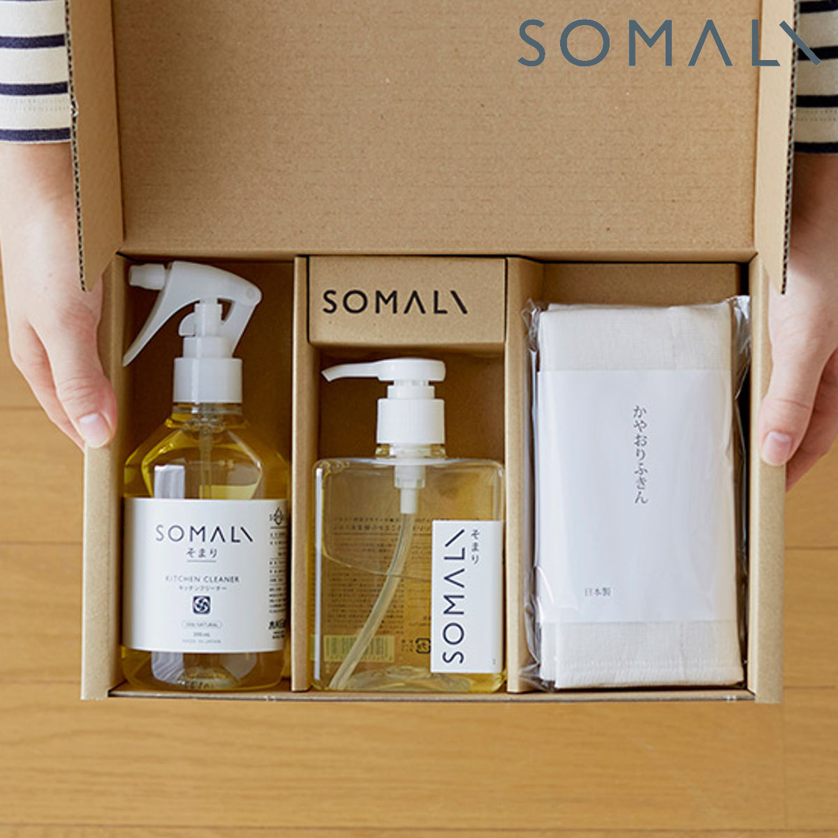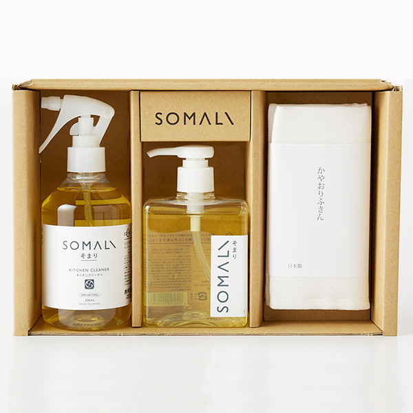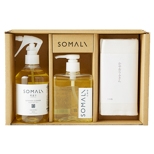 石けんの良さを最大限に引き出した【SOMALIシリシリーズ】の、キッチンクリーナー・台所用石けん・シンプルなかやおりふきんのセットです。クリーナーと石鹸は、ほのかに香るオレンジの匂いが心地良いです。安心の日本製なので、出産祝いや御新築祝い、内祝い等のギフトにおすすめです。