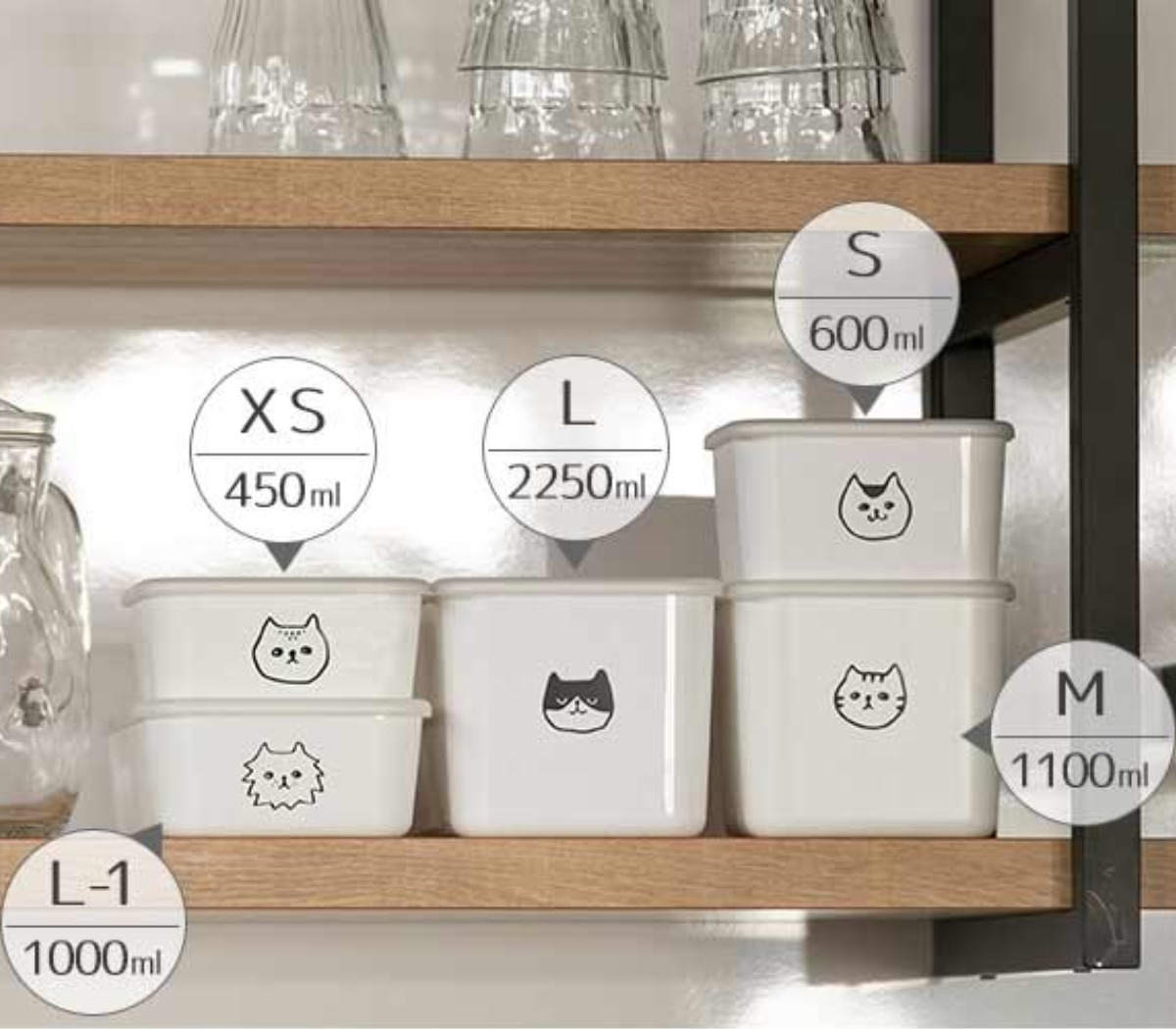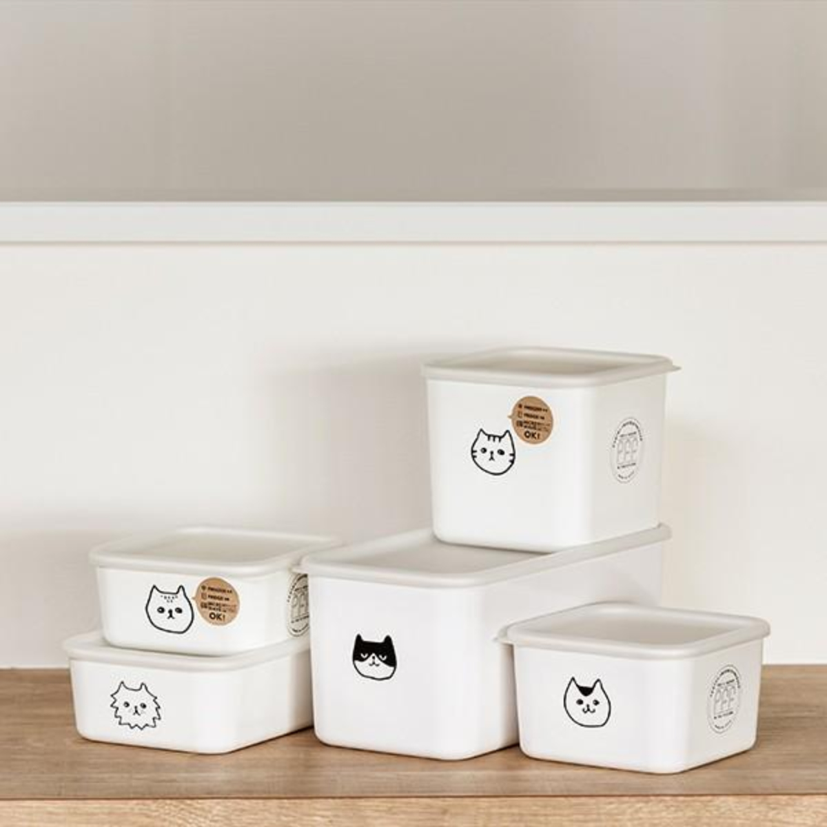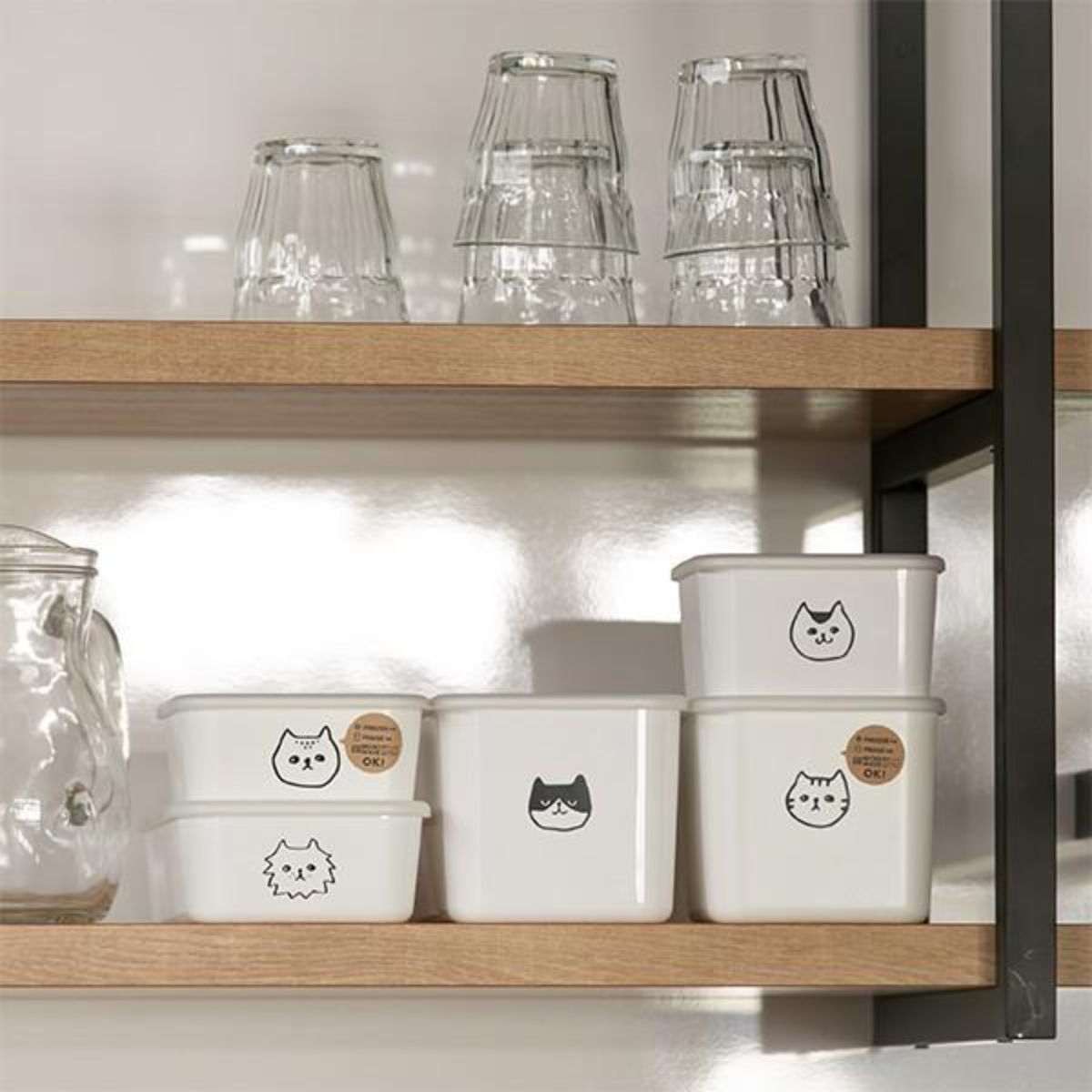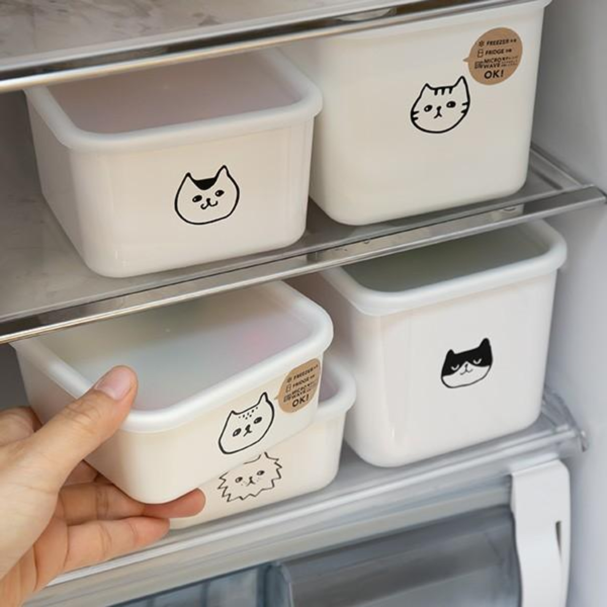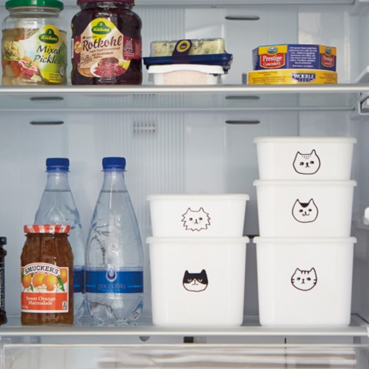 冷蔵庫の中でお行儀良くスタンバイするのは、スペースを有効に使えるスクエアタイプのストッカー。中身をネコの顔で分類する・・・なんて使い方も楽しいです。自然と気分が上がります。