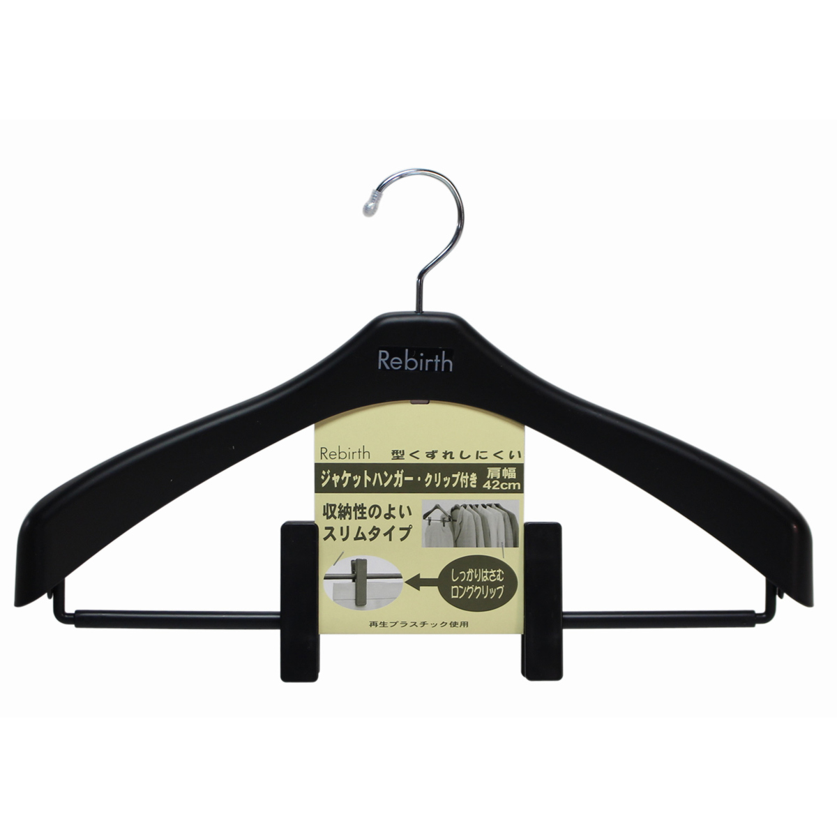 再生プラスチックを使った環境に優しい素材のジャケットハンガーです。スカートなどを掛けられるクリップが付いているので、スーツやセットアップなどを収納するのにお勧めです。