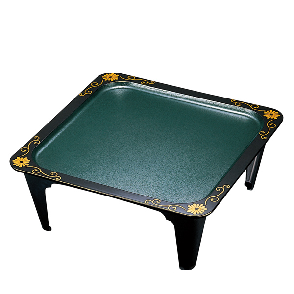 ●グリーンのたたき塗りに菊唐草文様の装飾をあしらった片面タイプのお膳です。
