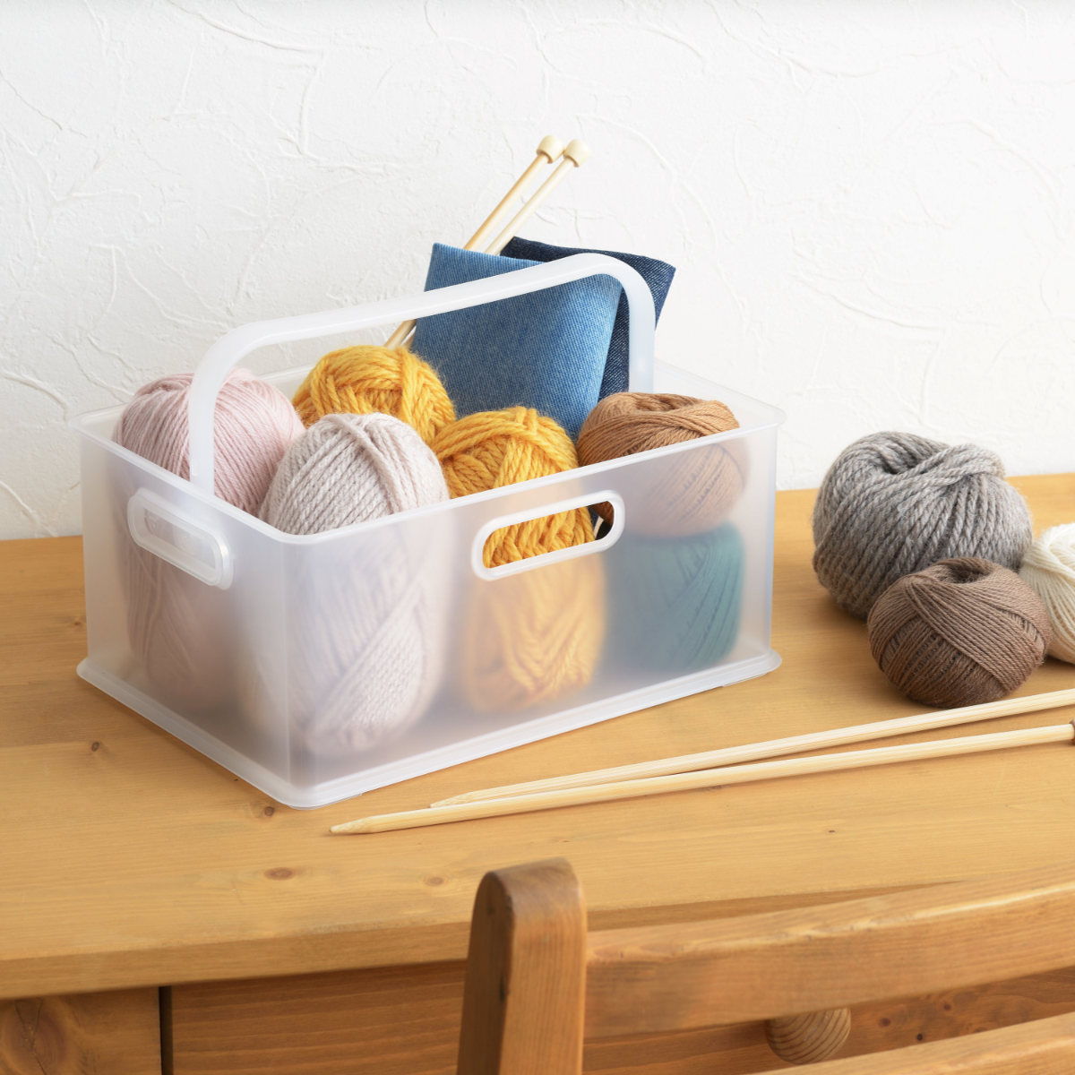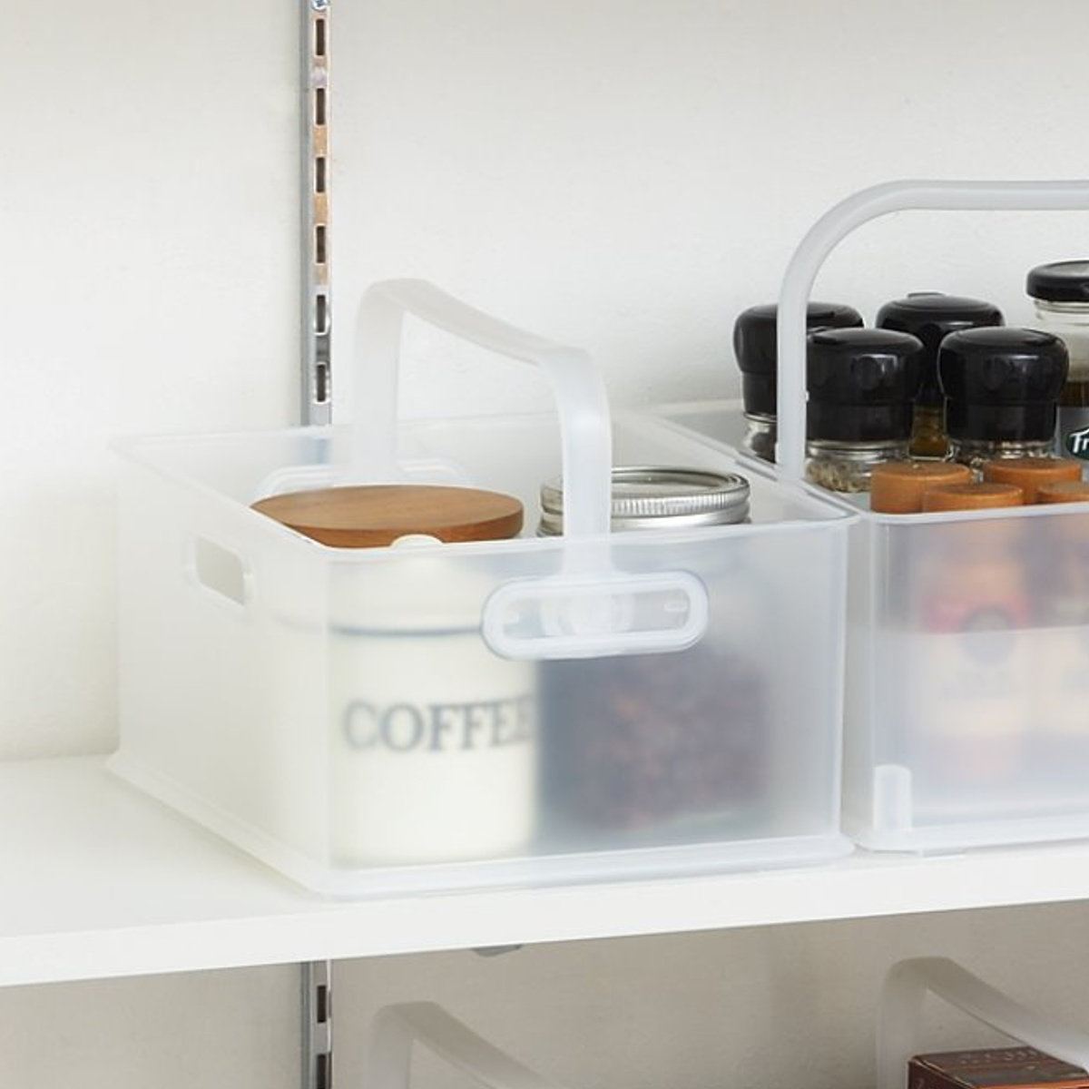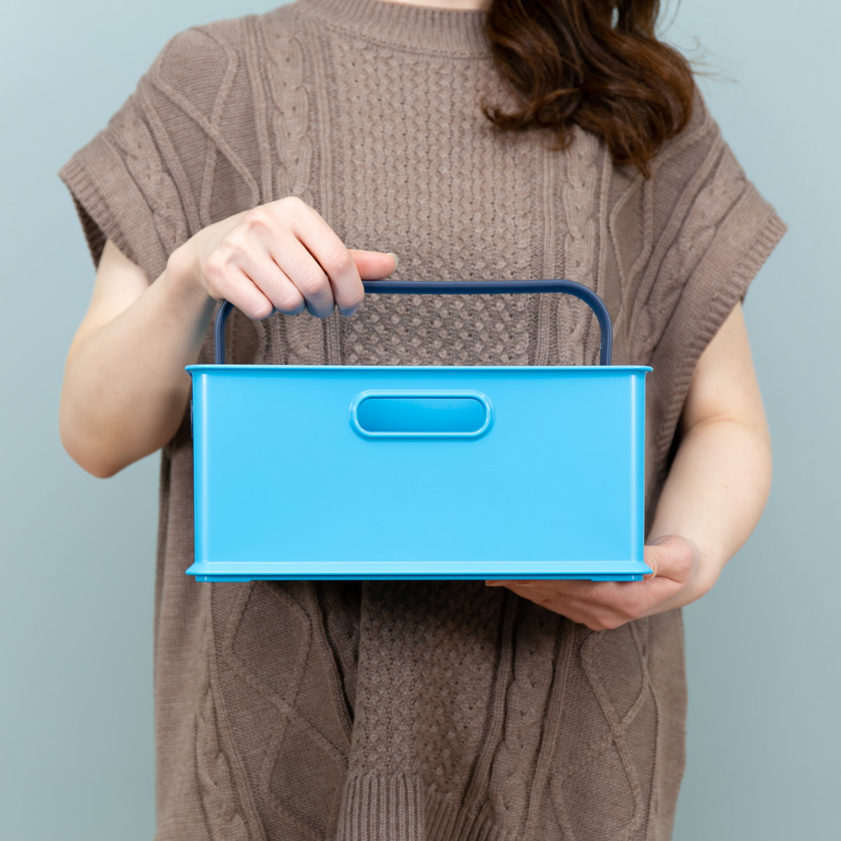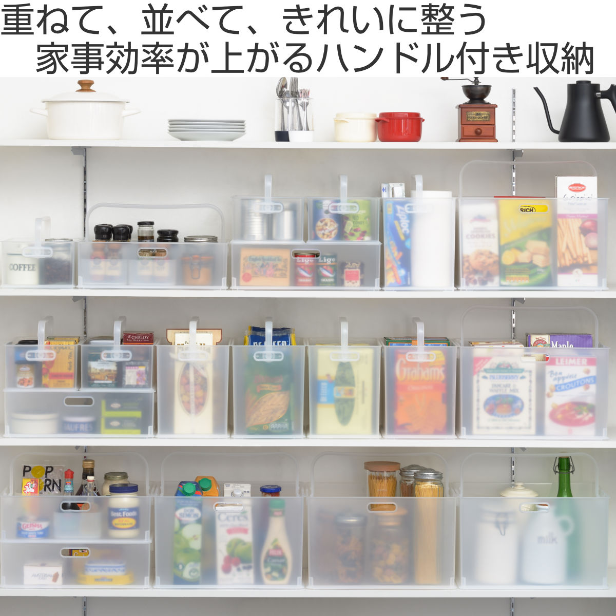 重ねて、並べて、スッキリ整う収納設計の収納ボックスです。並べて整理することで無駄のないレイアウトが生まれ、ハンドル付きだから収納したまま移動も可能です。使う場所へそのまま運べることで、家事の動線がスムーズになります。