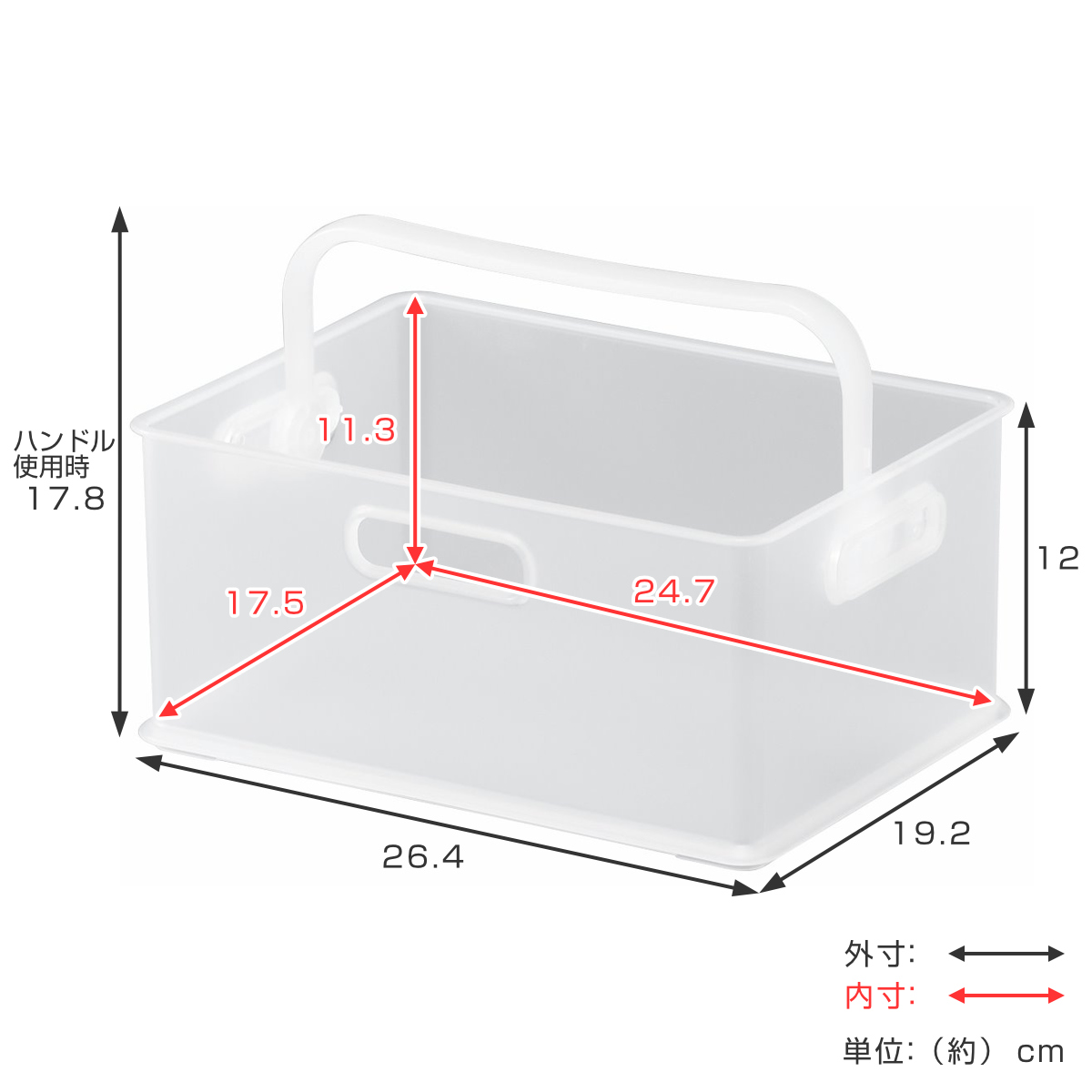 | サイズ | 外寸:約 幅26.4×奥行19.2×高さ12(cm) 内寸:約 幅24.7×奥行17.5×高さ11.3(cm) ハンドル使用時:高さ17.8(cm) |