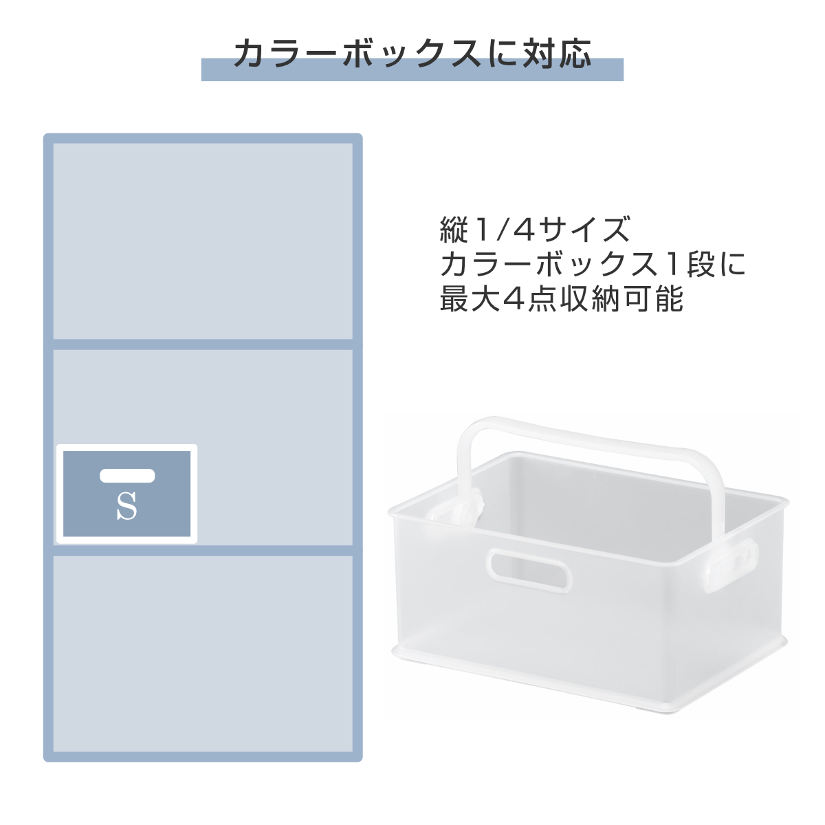 市販の横40cmカラーボックスに対応した設計です。Sサイズは1段に最大4個収納可能です。スペースや収納物に合わせてサイズを組み合わせれば、無駄のない収納が完成し、見た目もスッキリします。