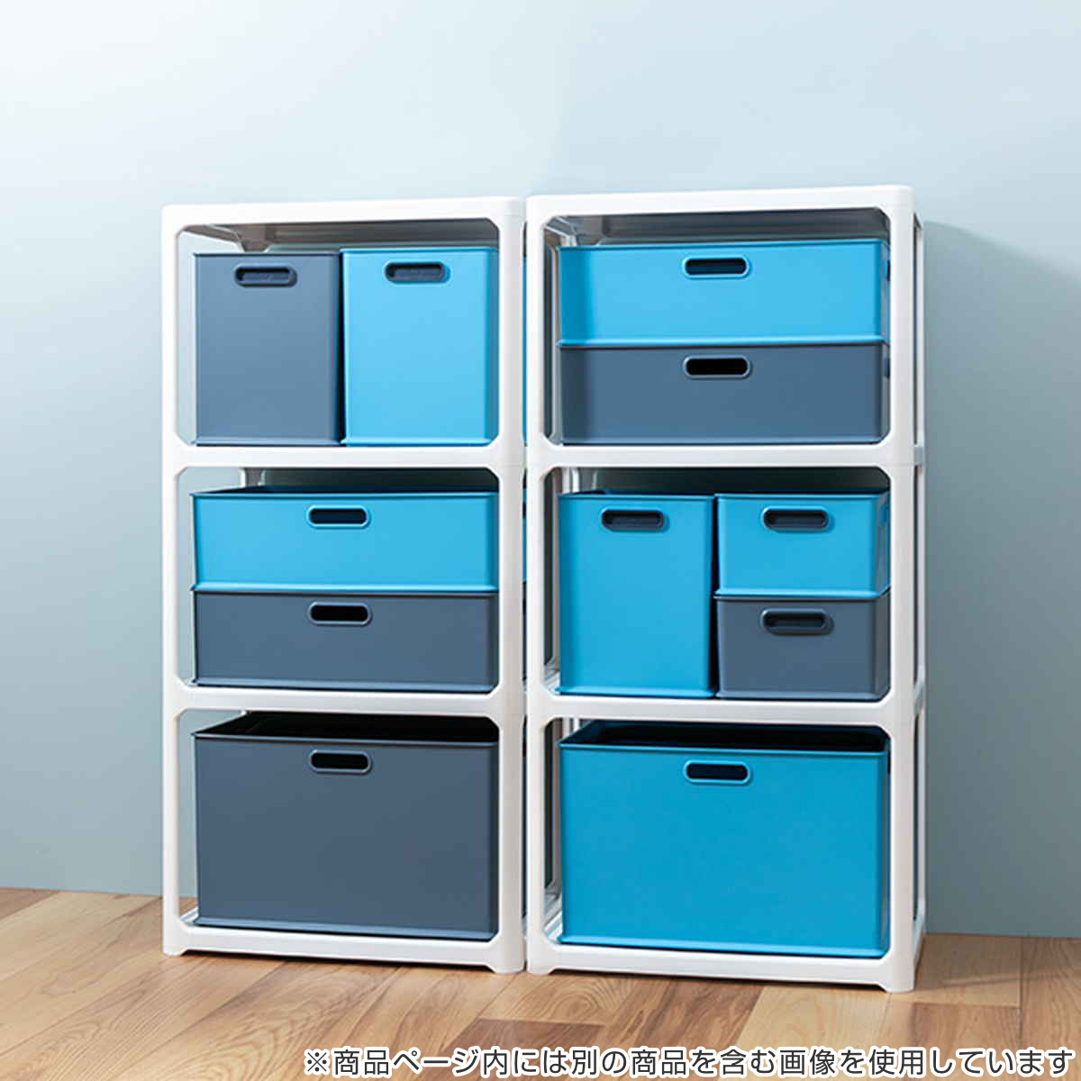 市販の横40cmカラーボックスに対応した設計です。Sサイズは1段に最大4個収納可能です。スペースや収納物に合わせてサイズを組み合わせれば、無駄のない収納が完成し、見た目もスッキリします。