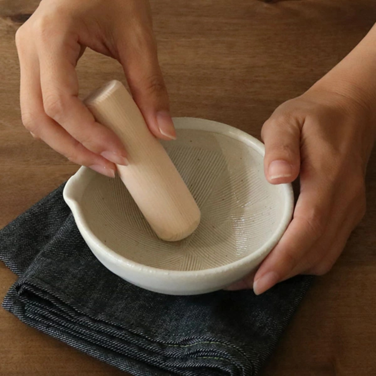 太めで手に馴染みやすく力が入れやすいので、すり心地がバツグンです。卓上で、ごまやスパイスをちょっと擂るのにちょうどいいサイズです。リニューアルして、紐を通す穴がなくなり、より洗いやすく清潔にお使いいただけます。