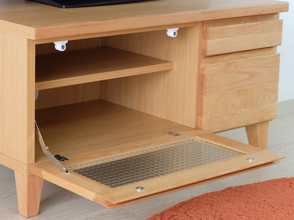 フラップ扉部分の背面に1ヵ所配線穴が付いています。DVDレコーダーやゲーム機などのAV機器の配線を後ろに通していただけるようになっているので、配線がごちゃつかず片付いた印象になります。