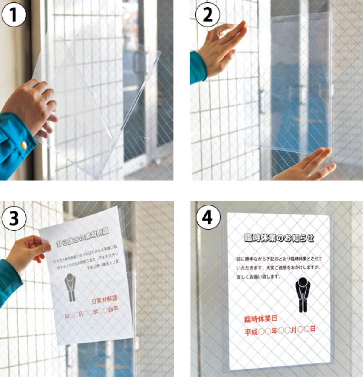 【3】掲示物を差し込みます。透明ですので、ガラス面に貼ると両面表示が可能です。