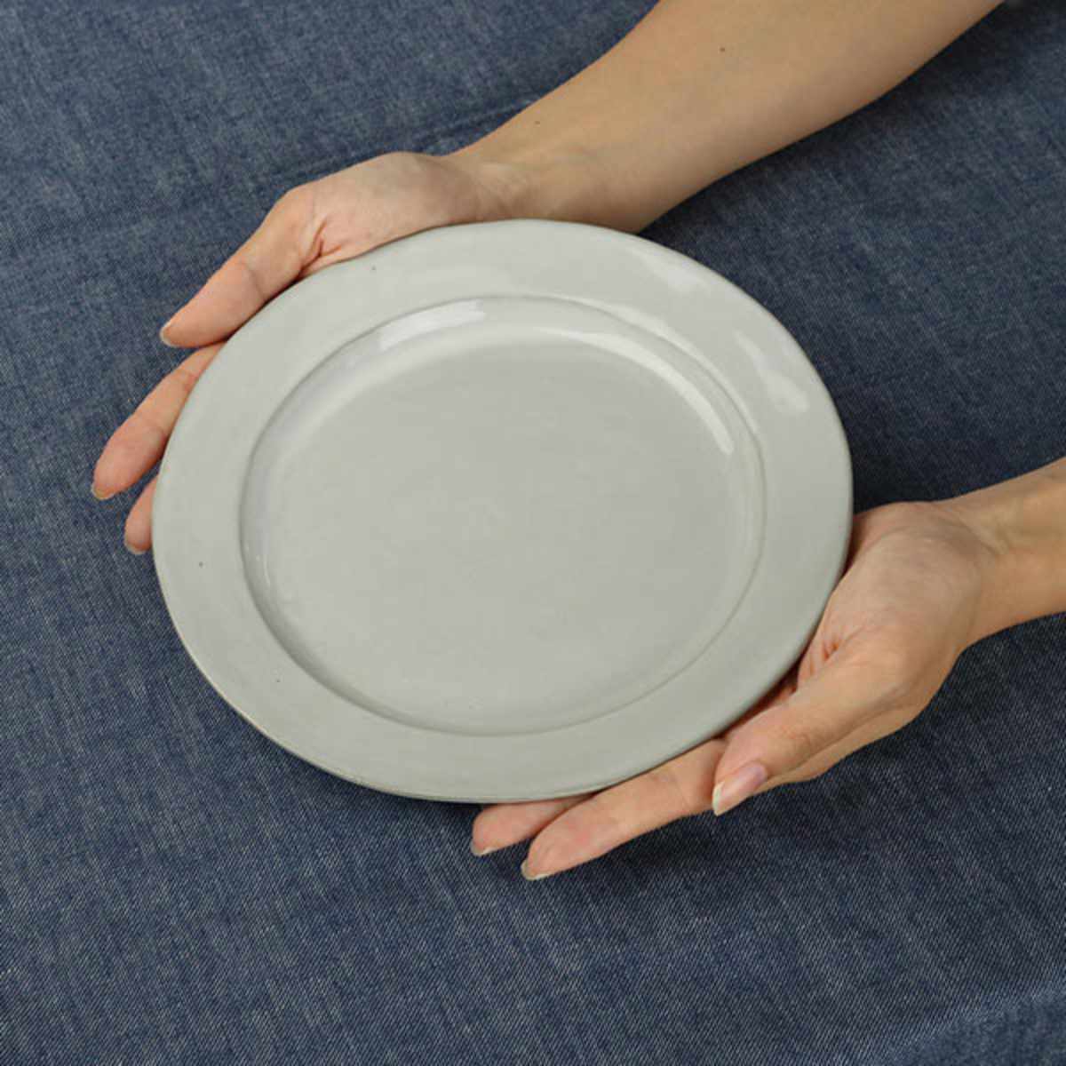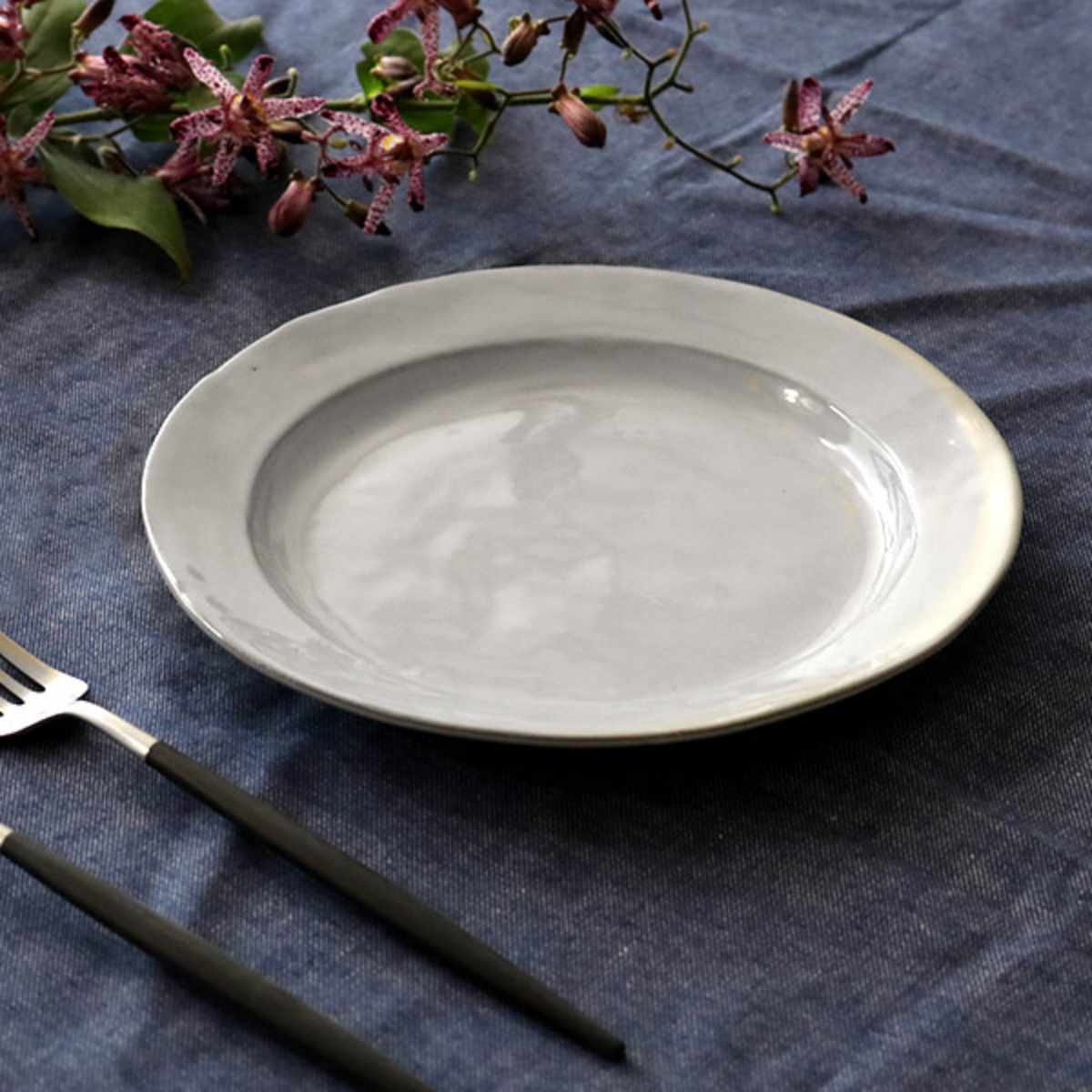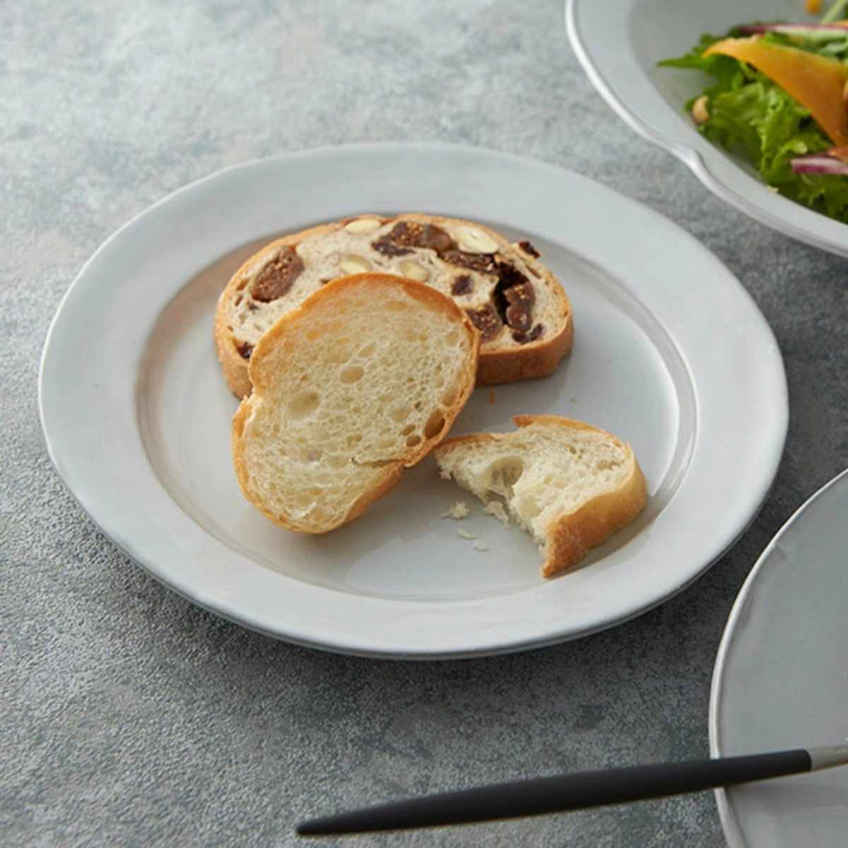 朝食のパンやティータイムのデザート、大皿料理の取り皿としてなど幅広く使っていただけるサイズのプレートです。リム(ふち)の程よい余白が食卓のアクセントとなり、優しいペールグレーの色味がお料理や野菜の色をより一層引き立てます。