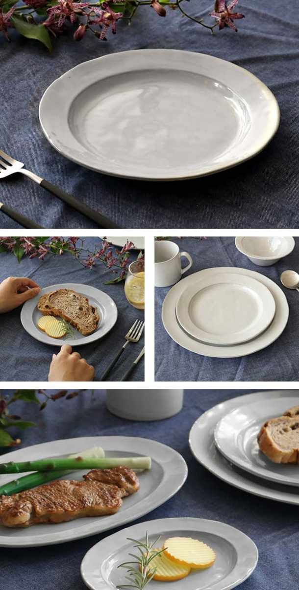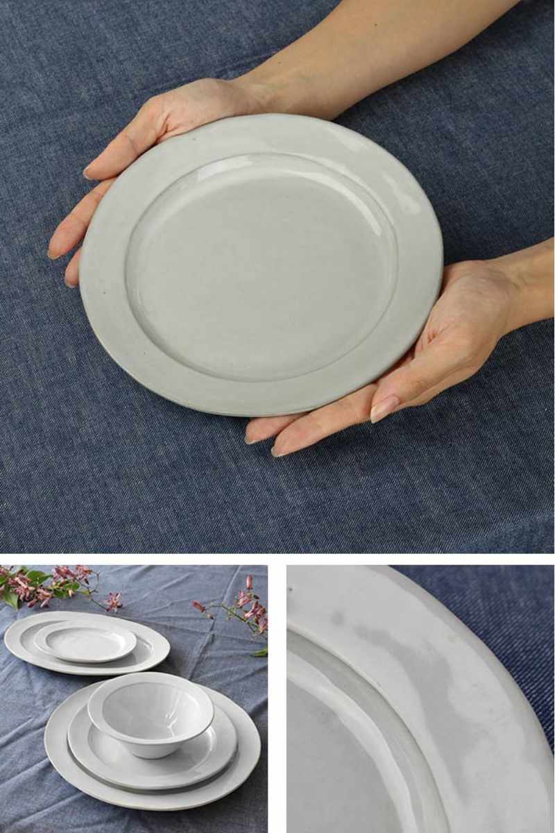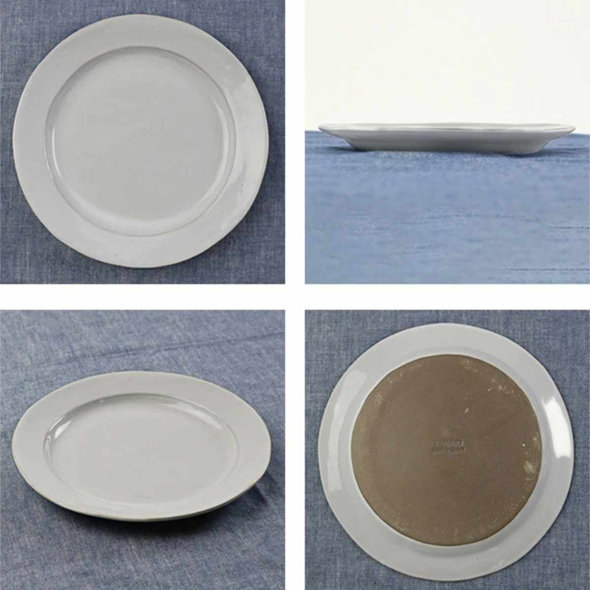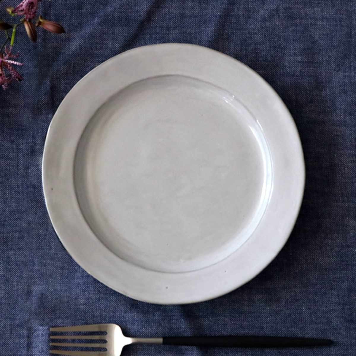 朝食のパンやティータイムのデザート、大皿料理の取り皿としてなど幅広く使っていただけるサイズのプレートです。リム(ふち)の程よい余白が食卓のアクセントとなり、優しいペールグレーの色味がお料理や野菜の色をより一層引き立てます。