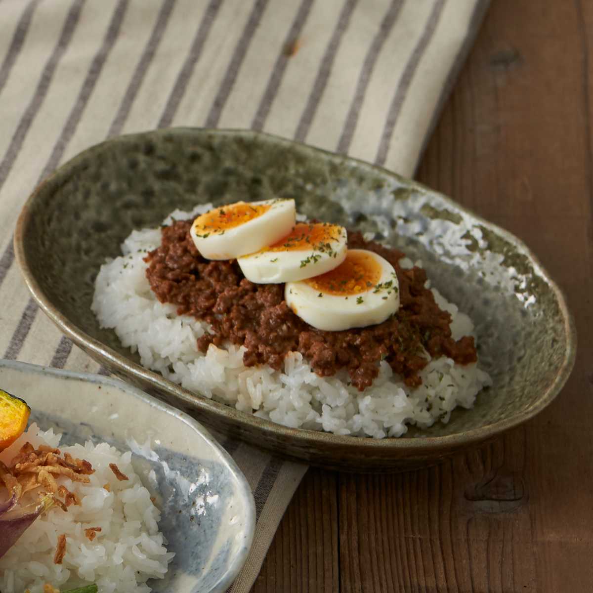 奥深い色合いが素朴な佇まいの緑釉には、野菜たっぷりのキーマカレーがぴったり。ゆで卵の黄色がキレイに映えます。1人分にちょうどいいサイズ感で、カレーはもちろんワンプレートごはんやパスタにも使いやすいです。