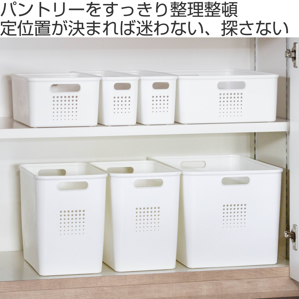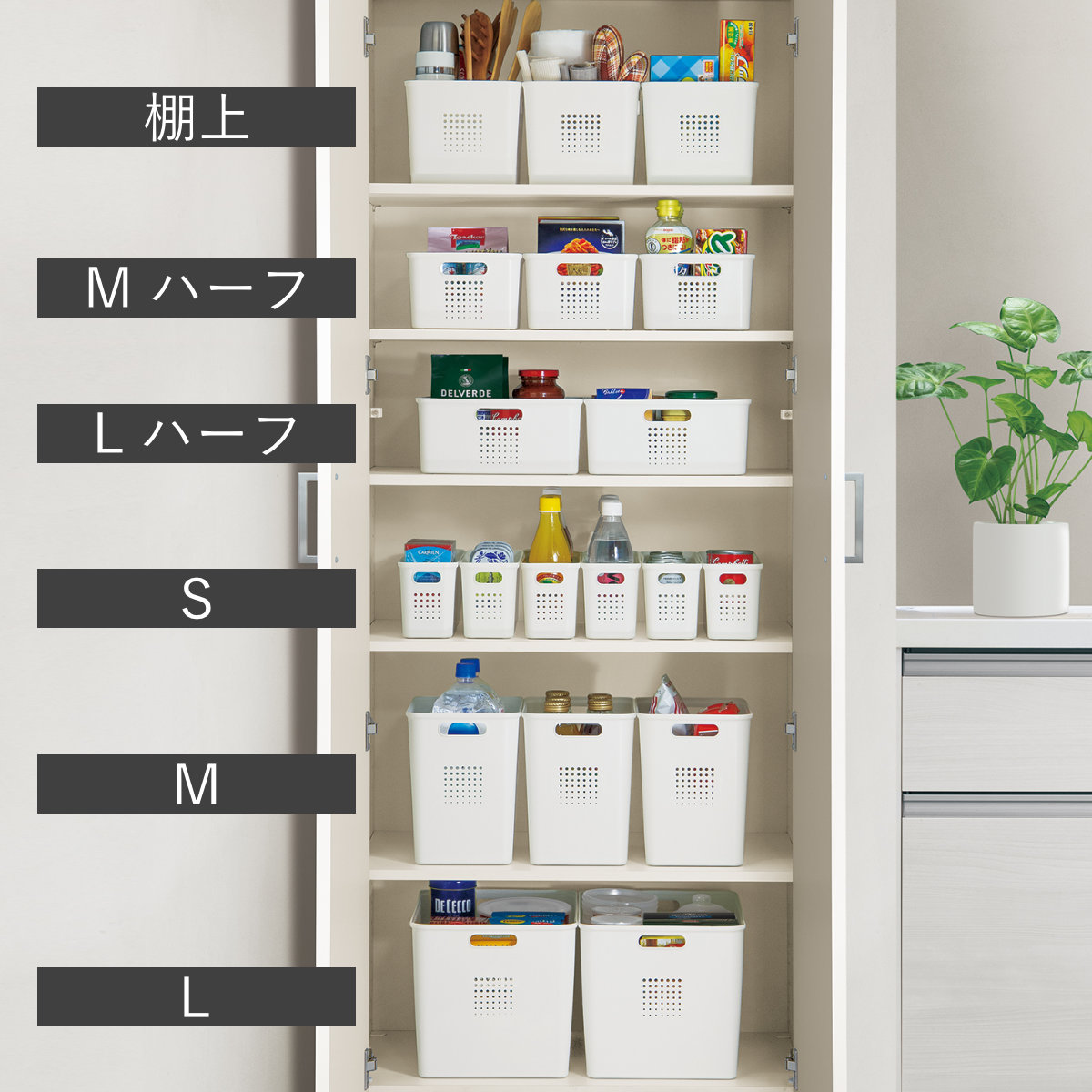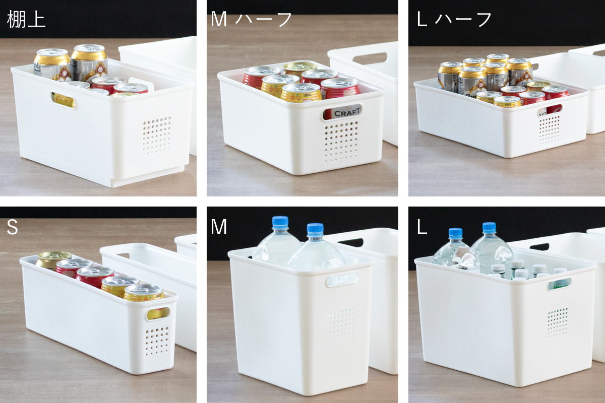 パントリーの中段や下段に適したLハーフサイズ。ジャムの瓶や缶詰など比較的背の低い物の収納におすすめです。両サイドに持ち手が付いており、引き出しやすく使い勝手のよい設計です。