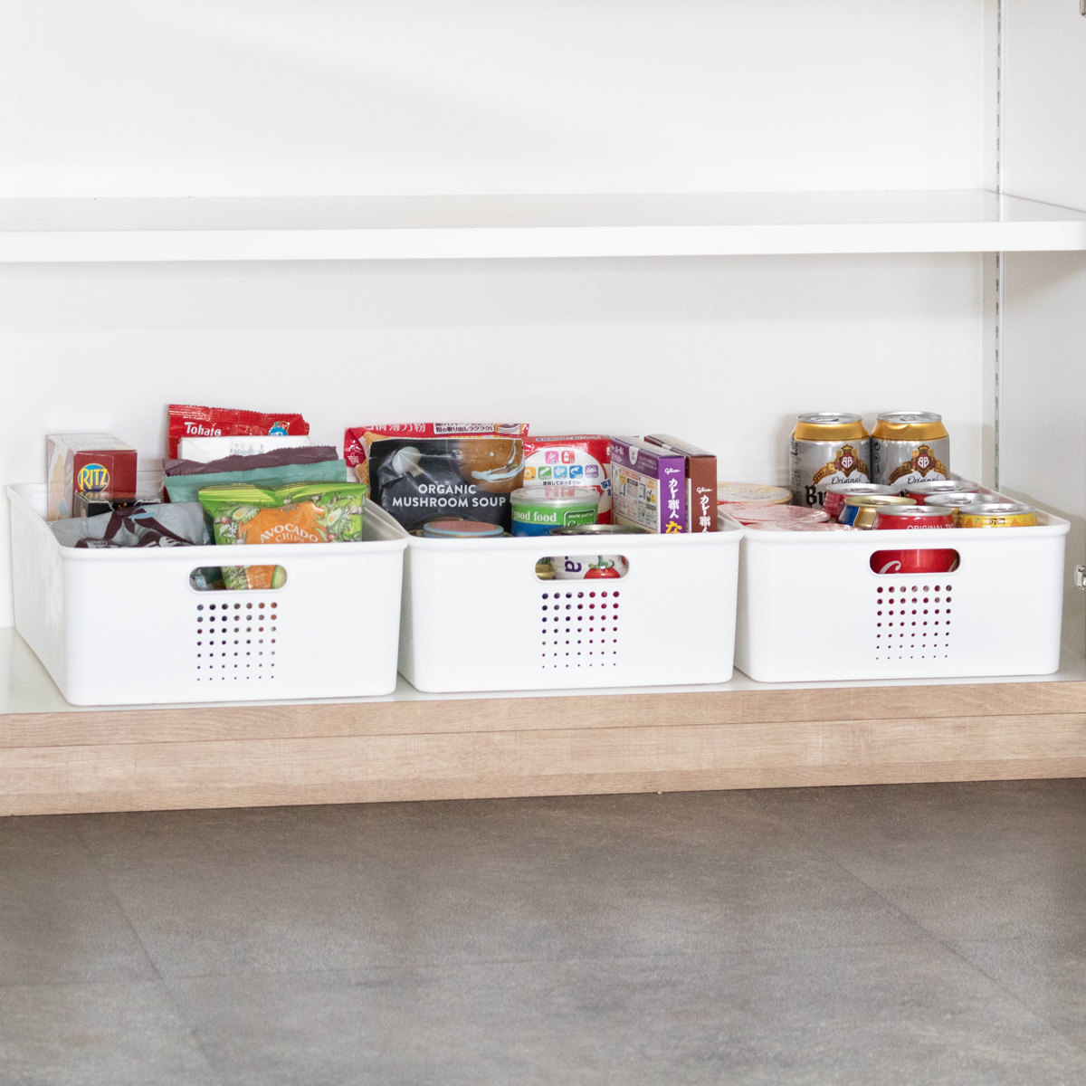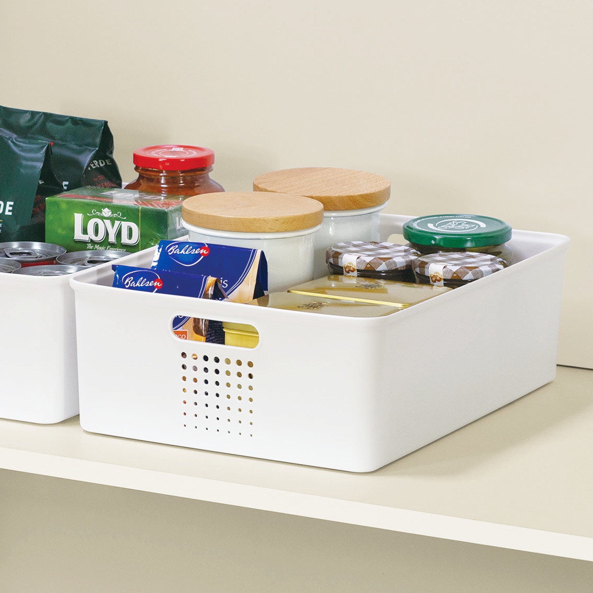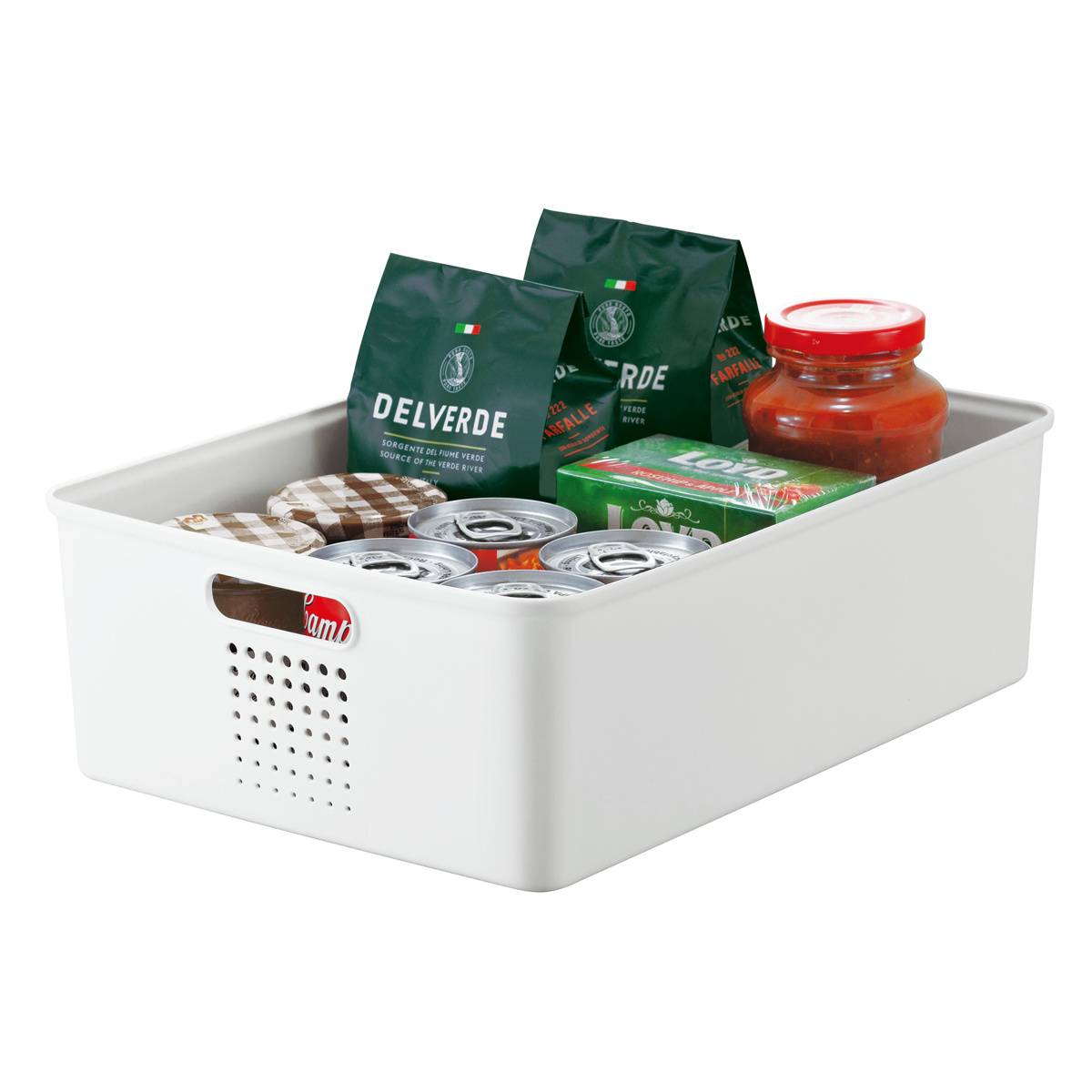 パントリーの中段や下段に適したLハーフサイズ。ジャムの瓶や缶詰など比較的背の低い物の収納におすすめです。両サイドに持ち手が付いており、引き出しやすく使い勝手のよい設計です。