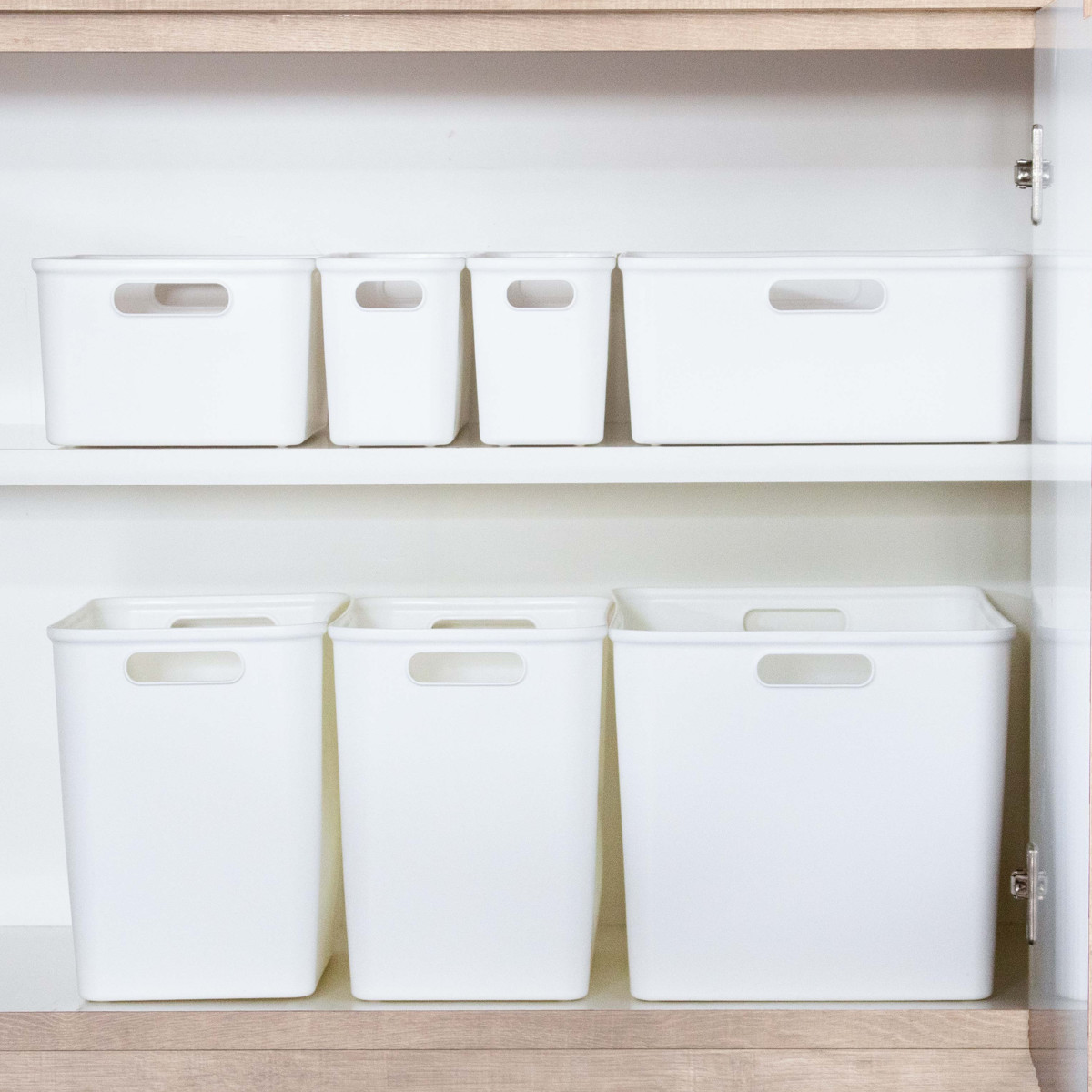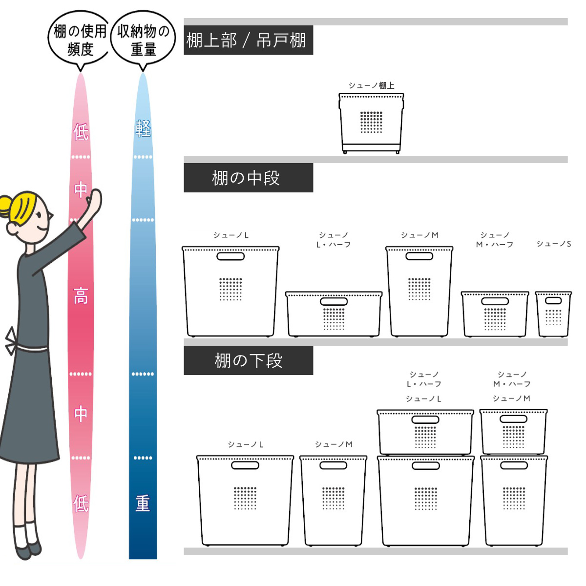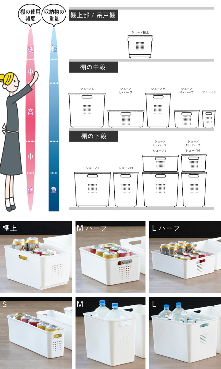 シューノシリーズは、棚の各段で使いやすい6サイズを展開。上段には軽くて使用頻度の低い物、中段にはよく使う物、下段には重い物や大きな物と、収納の傾向に合わせて選べます。スペースを無駄なく活用でき、すっきりとした収納づくりをサポートします。