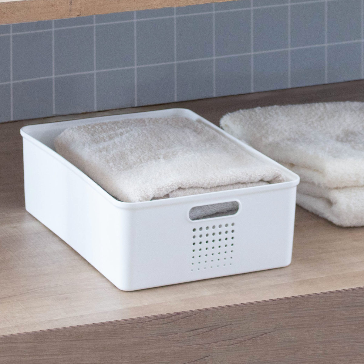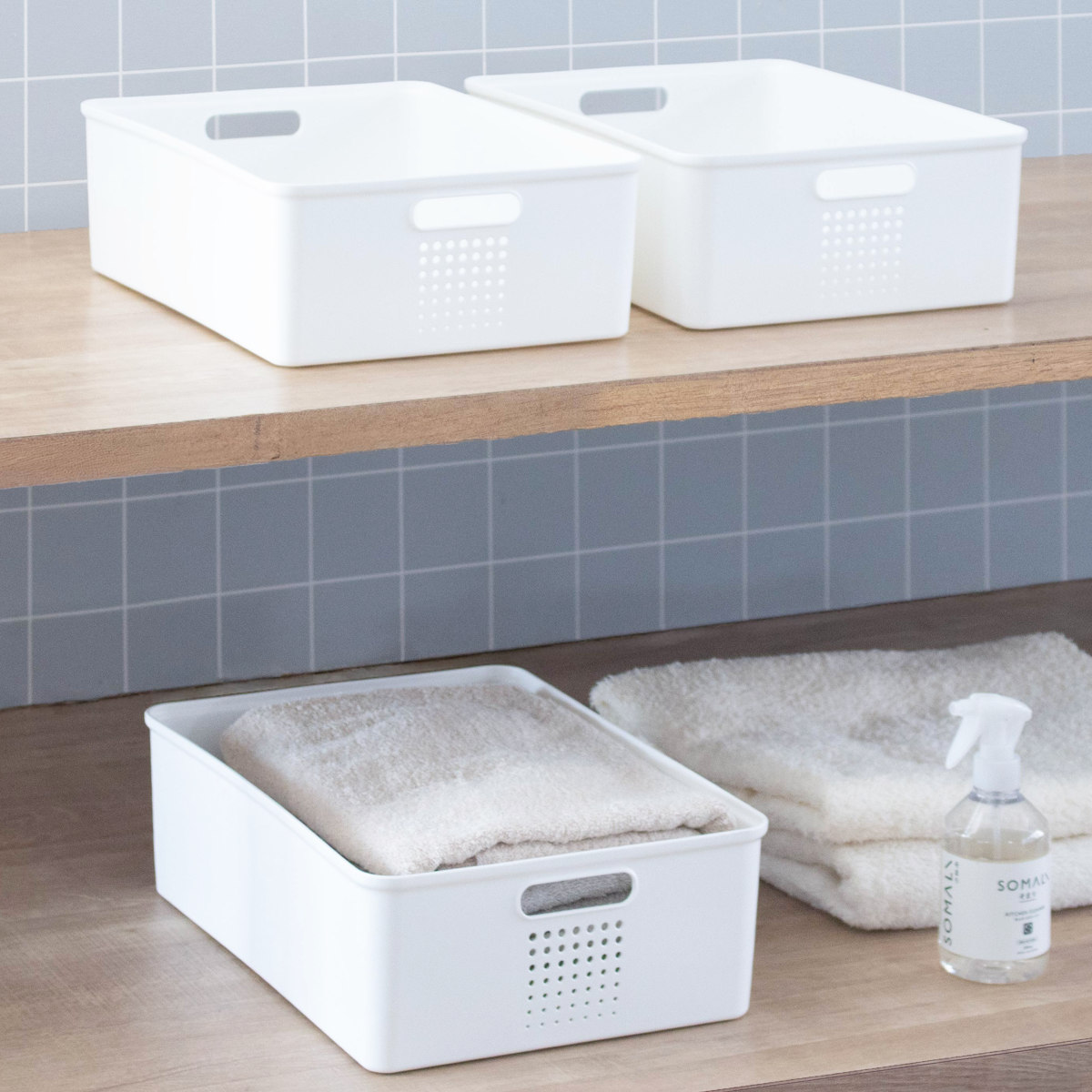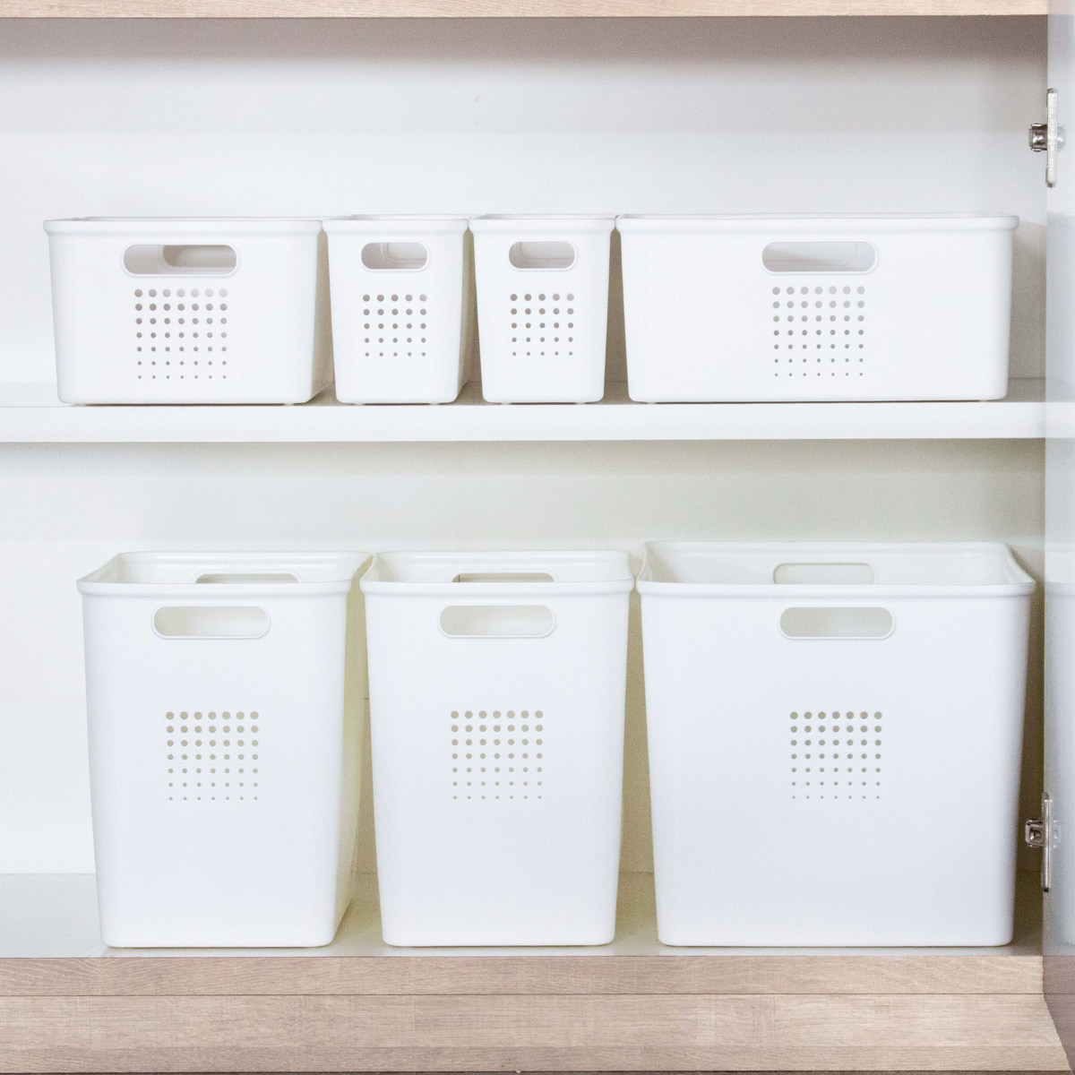 シューノシリーズは、棚の各段で使いやすい6サイズを展開。上段には軽くて使用頻度の低い物、中段にはよく使う物、下段には重い物や大きな物と、収納の傾向に合わせて選べます。スペースを無駄なく活用でき、すっきりとした収納づくりをサポートします。