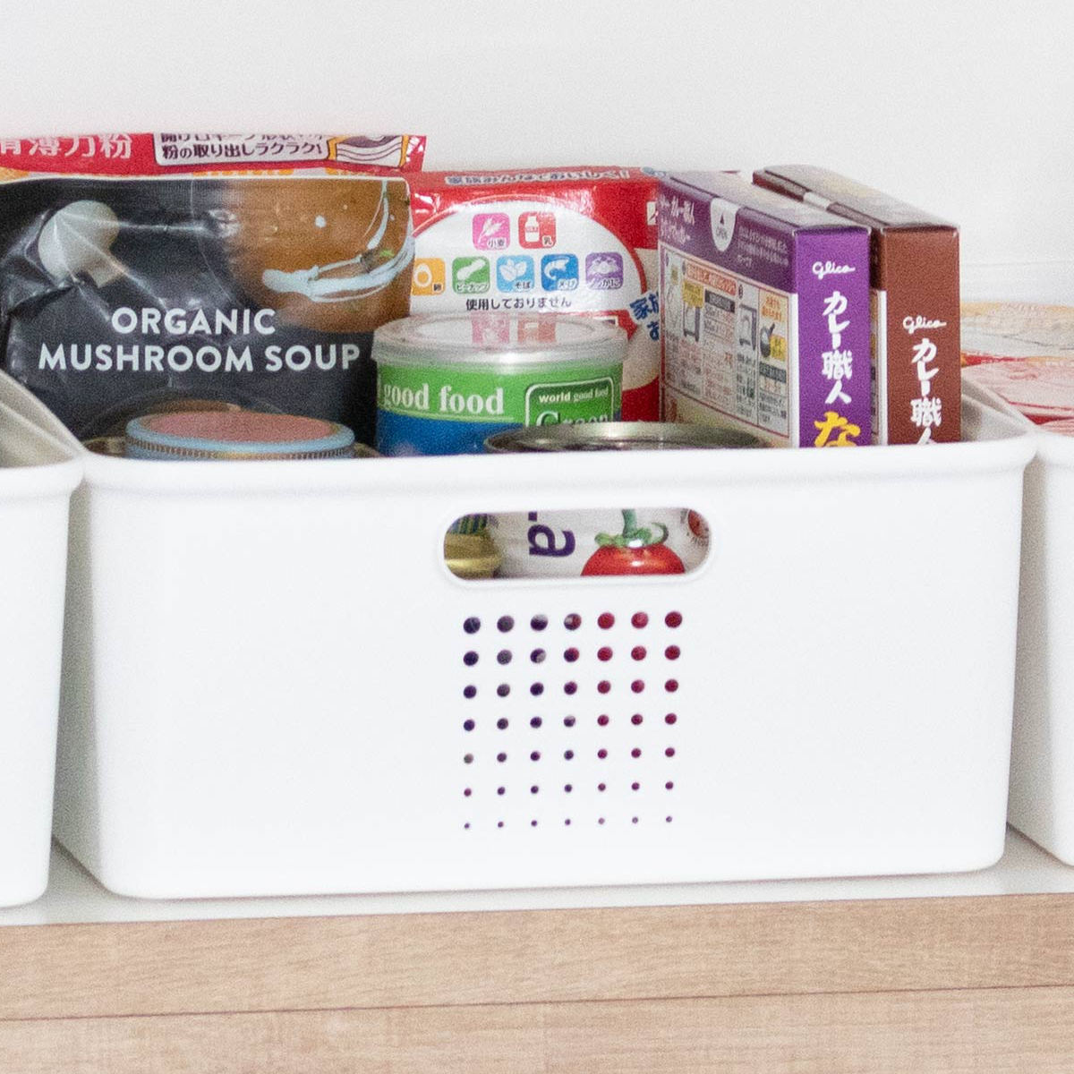 大小さまざまな物であふれがちなキッチンに最適な、シューノシリーズの収納ボックス。ボックスで分類することで、物の定位置が決まり、ひと目で分かる収納に。無駄な買い足しや探す手間を減らし、快適なキッチン動線を実現します。