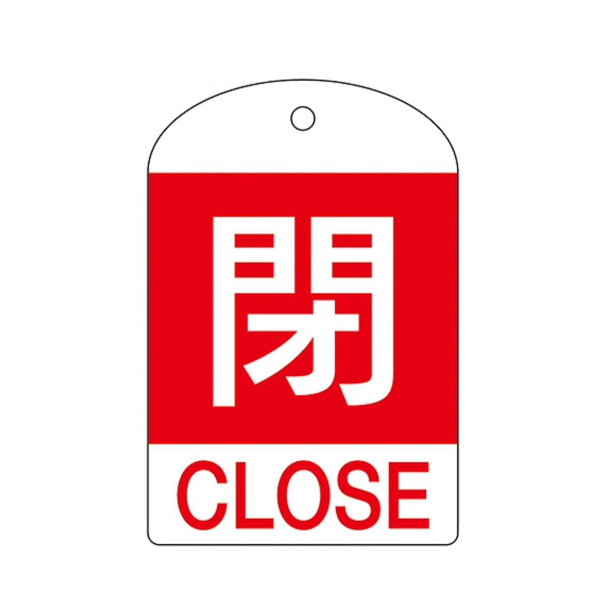 バルブ開閉札 英文字入り 赤 「 閉 」 10枚入 特15-302A 日本製 ( 両面印刷 ラミネート加工 バルブ 開閉 札 安全 フダ ふだ 表示 表示板 英語表記 英字 英語 表記 事業所 工場 現場 作業 用品 グッズ 安全用品 )