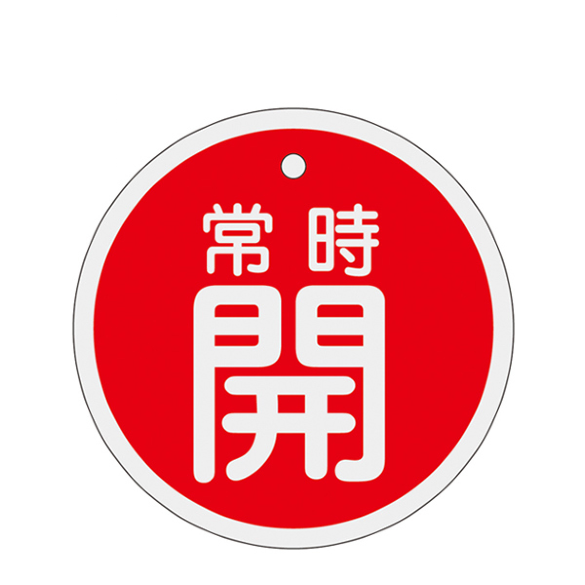 アルミバルブ開閉札 赤 直径8cm 「 常時 開 」 特15-96A アルミ 日本製 ( アルミ製 両面印刷 バルブ 開閉 札 安全 フダ ふだ 表示 表示板 事業所 工場 現場 作業 用品 グッズ 安全用品 )