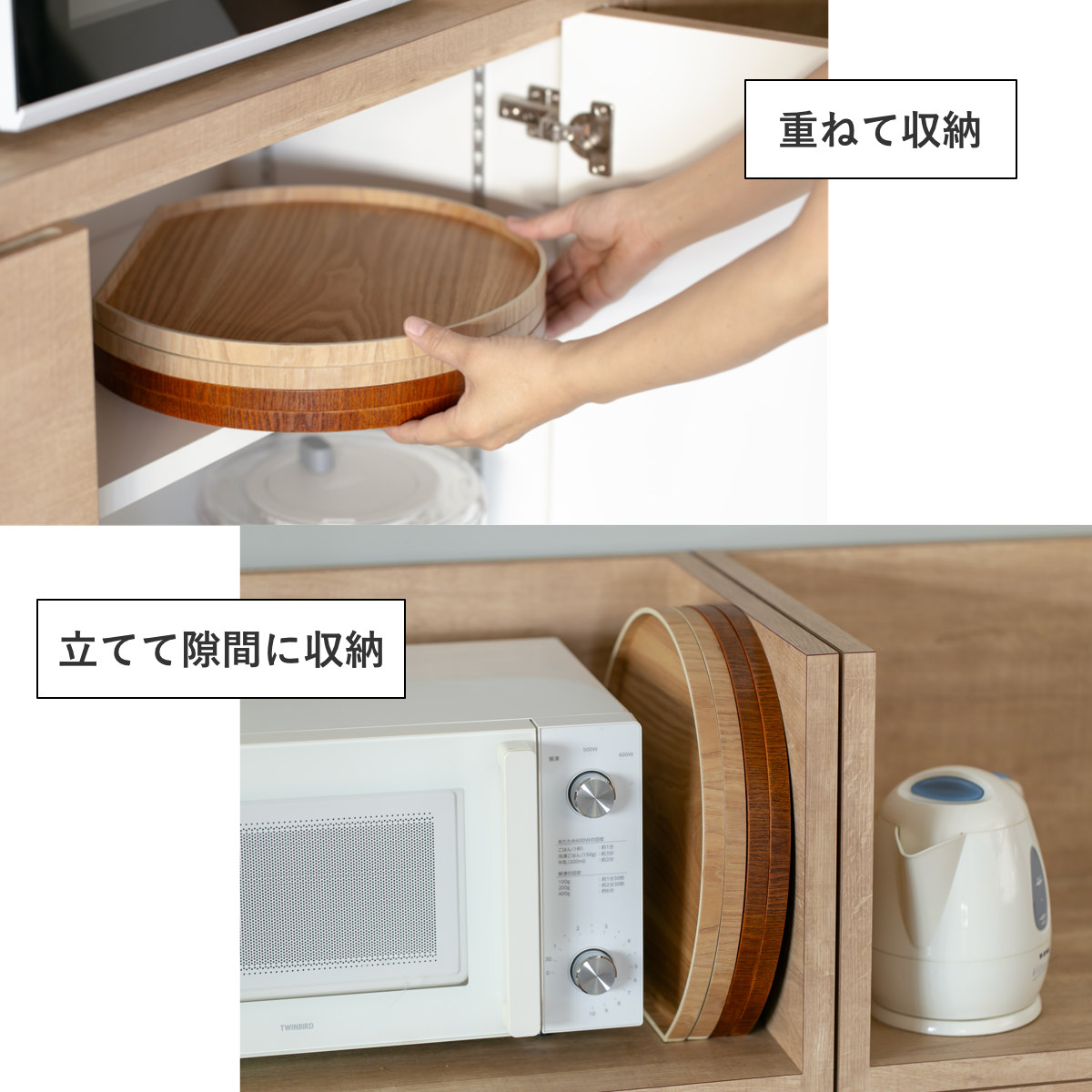 重ねて収納できます。また、半月型なので立てて収納すると転がりにくいです。