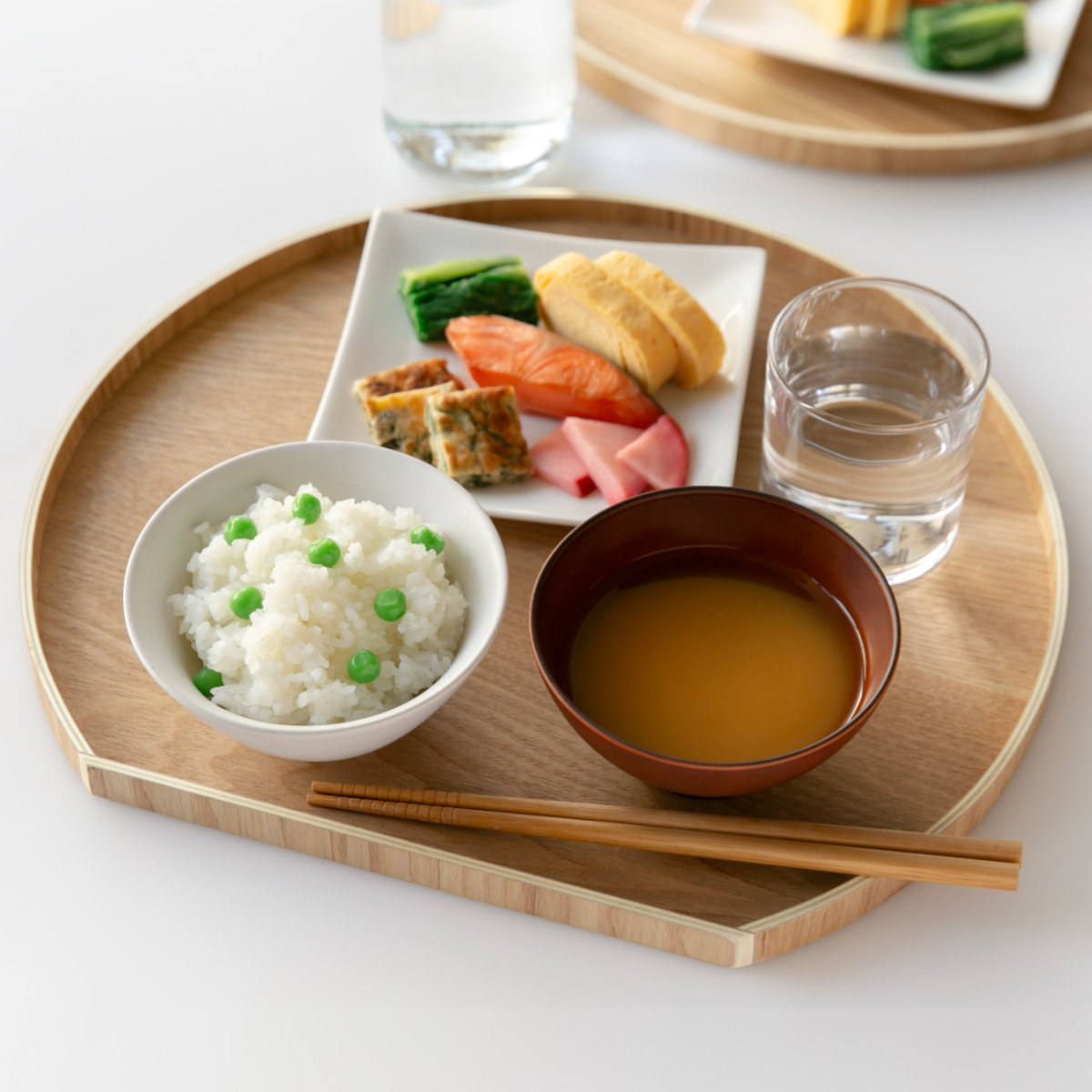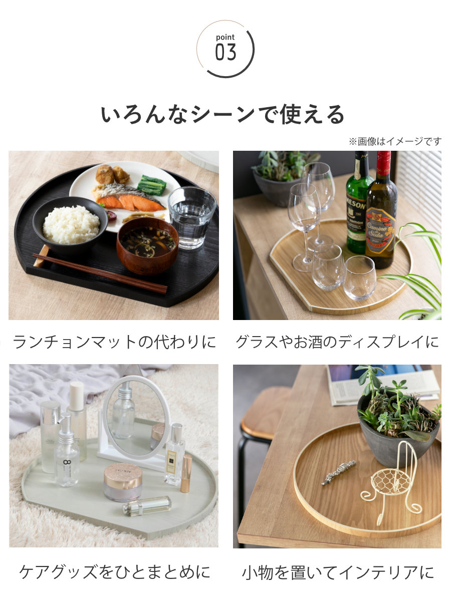 手に馴染む天然木のぬくもりと気品あふれるトレーです。半月型のフォルムが優しげで、和洋問わずどんなお料理も引き立ててくれます。1人分のお茶碗と汁椀、主菜を置けるぐらいのサイズ感です。