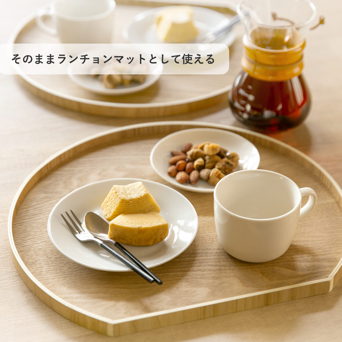 1人分のお食事をセットして、そのままランチョンマットとして使うのも素敵です。布のランチョンマットと違って、こぼしてもサッと拭けるので使い勝手も抜群です。