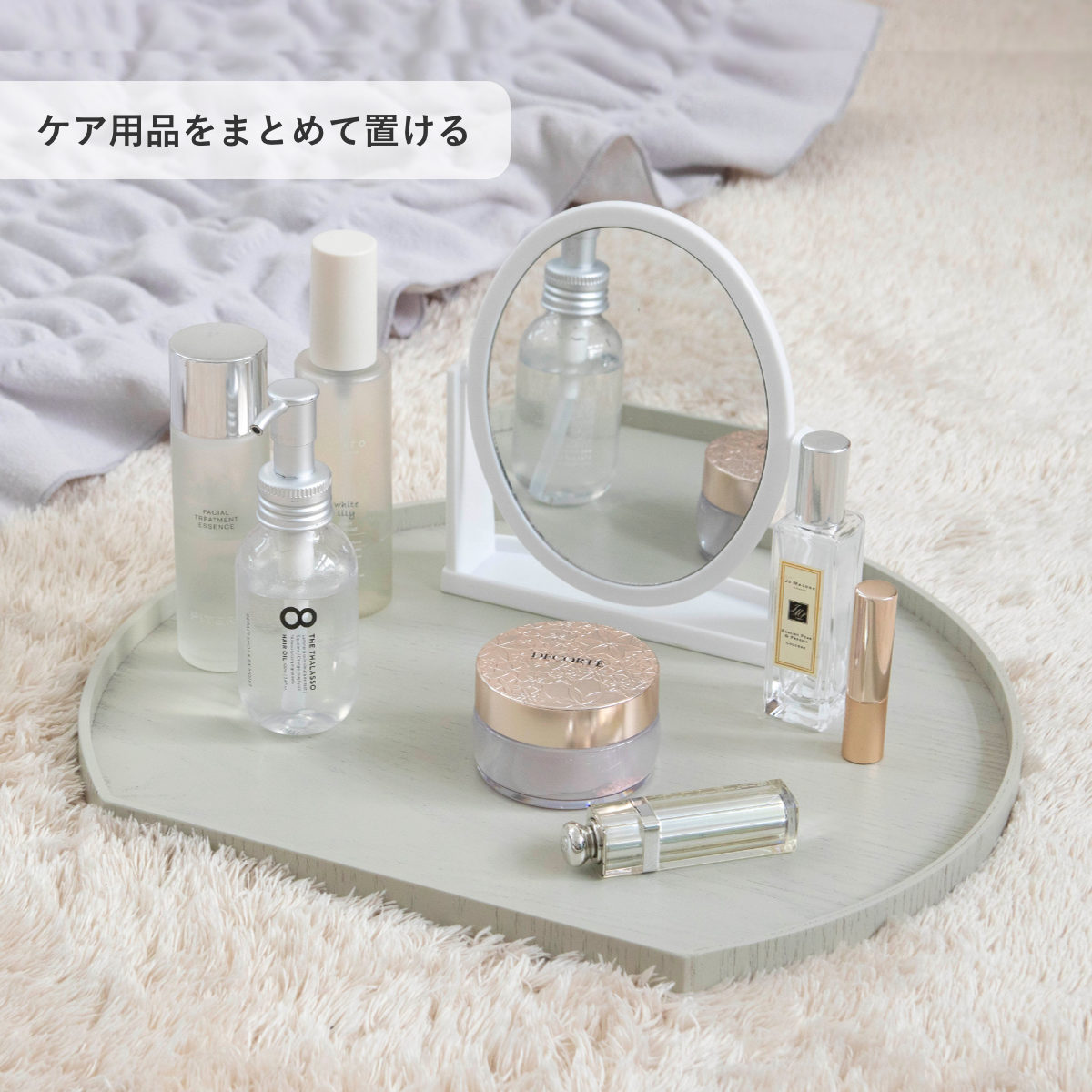 ハンドクリームやアロマスプレーなどケアグッズをまとめておくトレーとして使うのもおすすめです。お気に入りの香りグッズでケアすれば、気持ち良く眠れそうです。