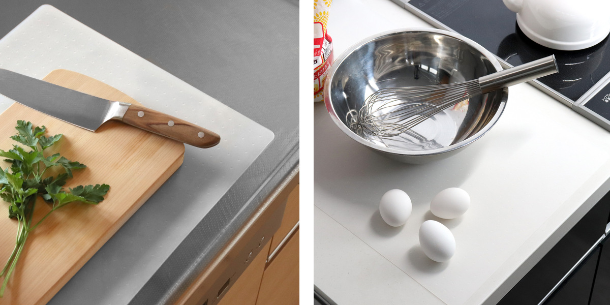 ![]() 水切りができる調理台保護シート | ![]() システムキッチンの耐熱調理台保護シート |