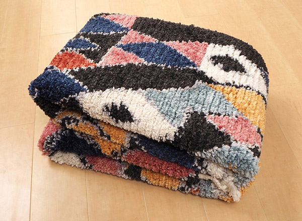 高い耐久性が特徴のウィルトン織りに特殊な加工技術を施し、ウィルトンラグには珍しい折りたたむことができるほどの柔らかさを実現しました。収納時は場所を取らず、丈夫なので長くお使い頂けます。